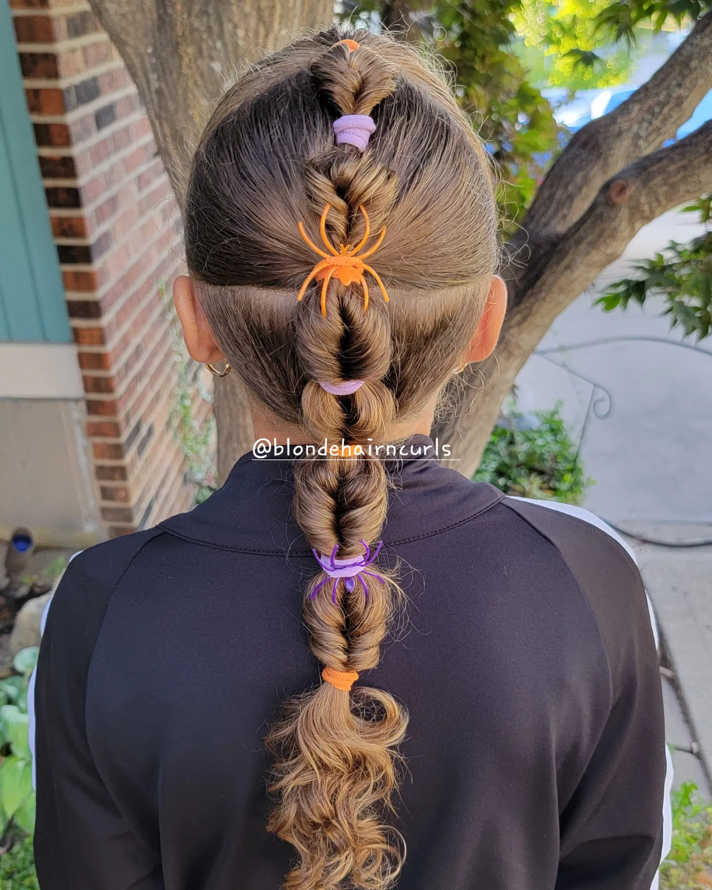 Each bubble section is gently pulled for volume, giving the braid its soft fishtail shape. A few bright plastic spiders are added for a spooky, playful touch.
