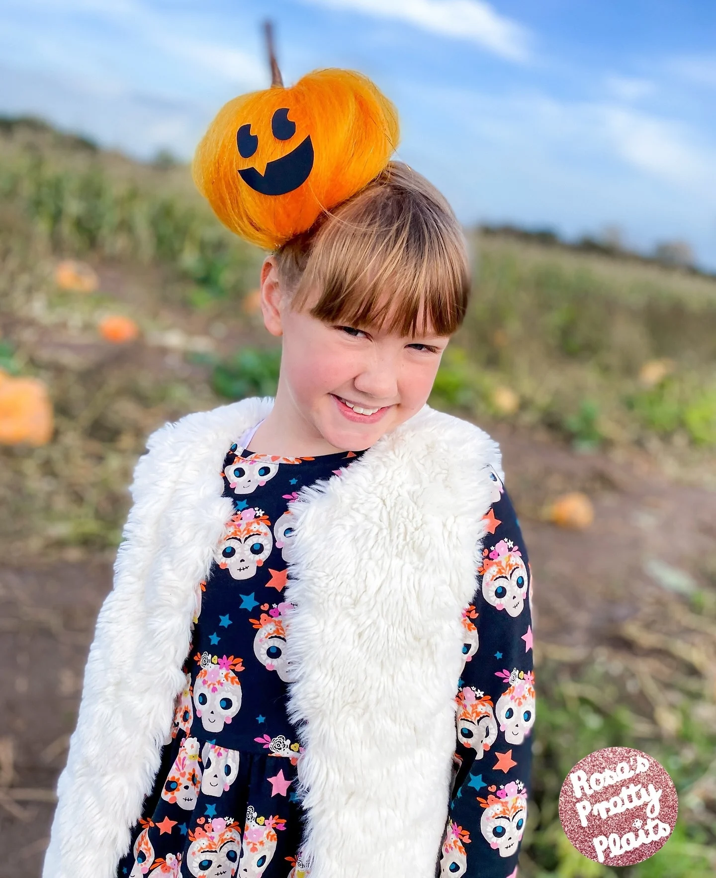 This adorable hairstyle turns the top of the head into a sparkling pumpkin design.