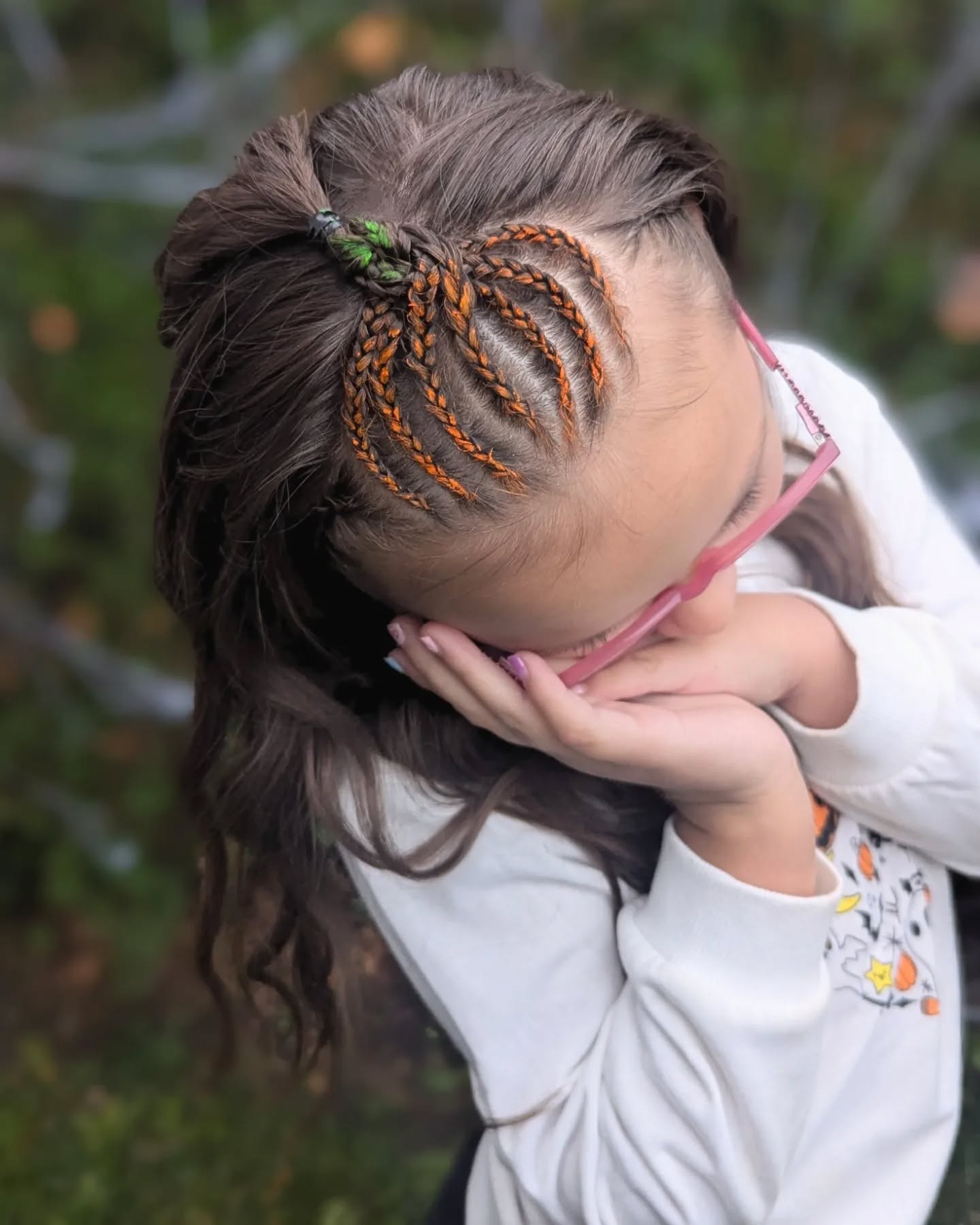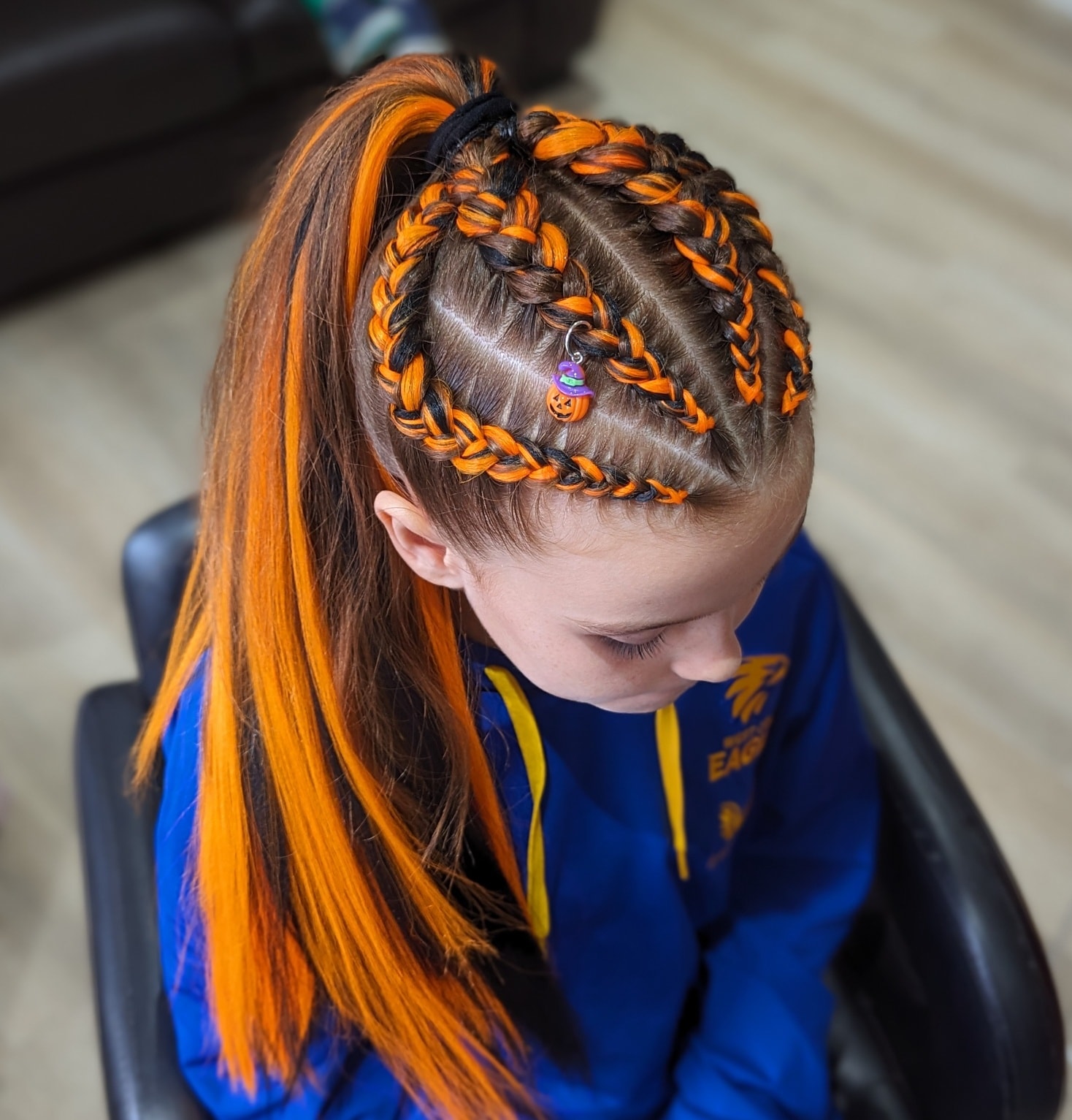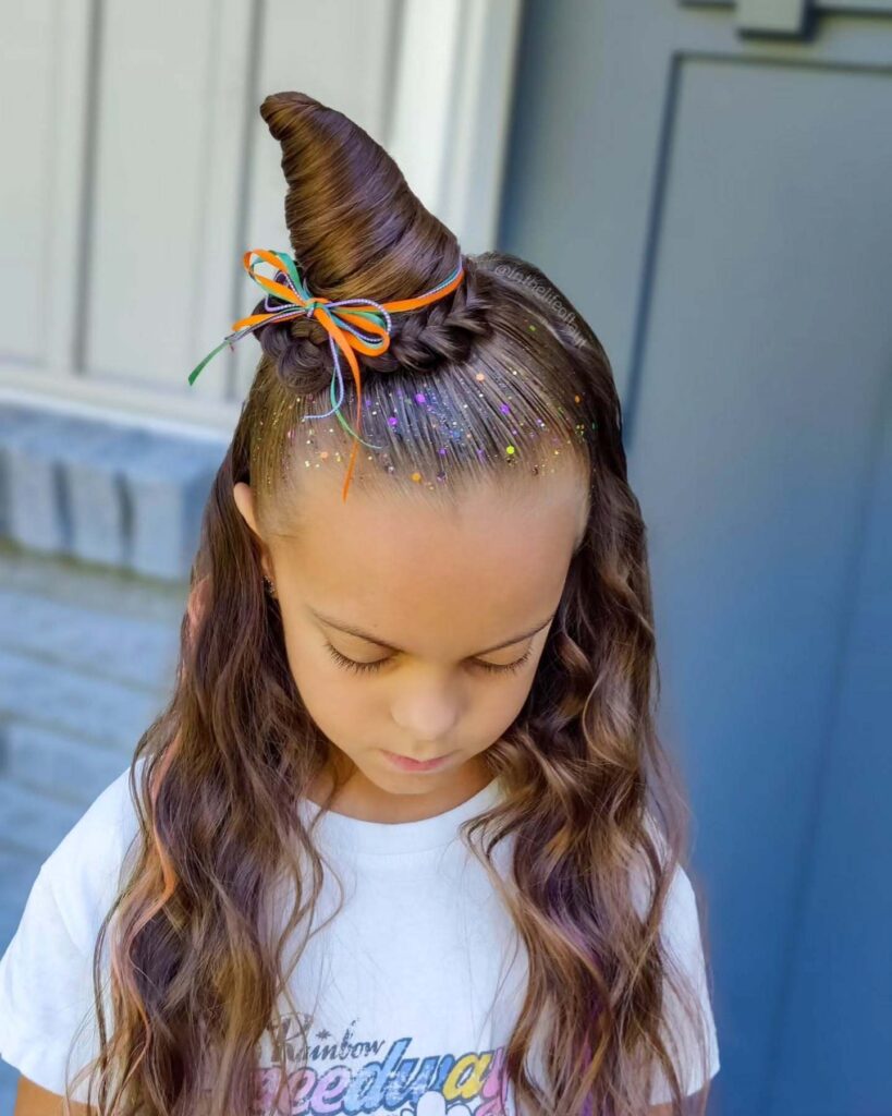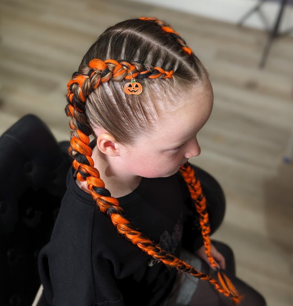 It’s a bright, playful hairstyle that perfectly fits the Halloween season and works great for school events or trick-or-treating fun.