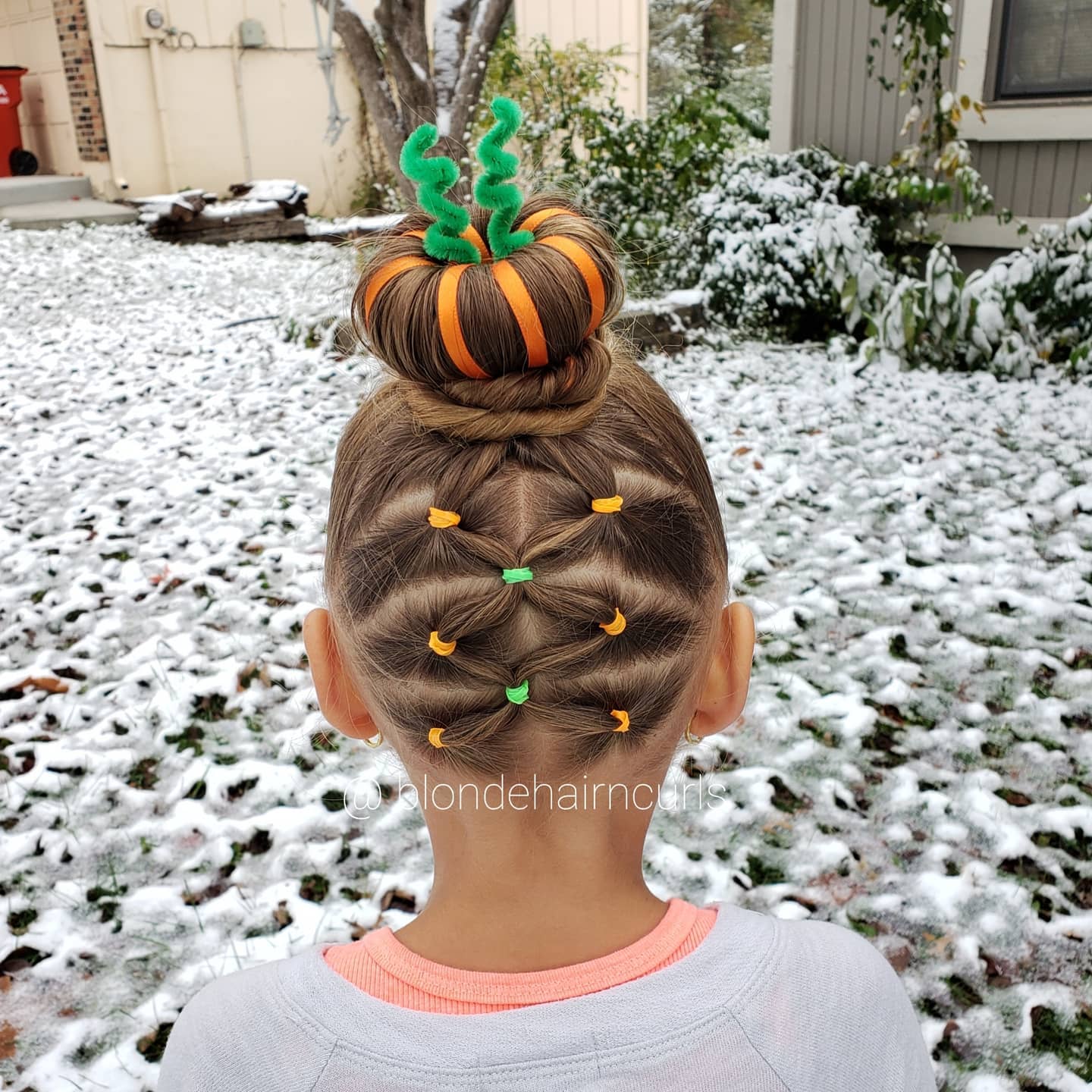 This adorable hairstyle transforms a simple bun into a festive pumpkin design.