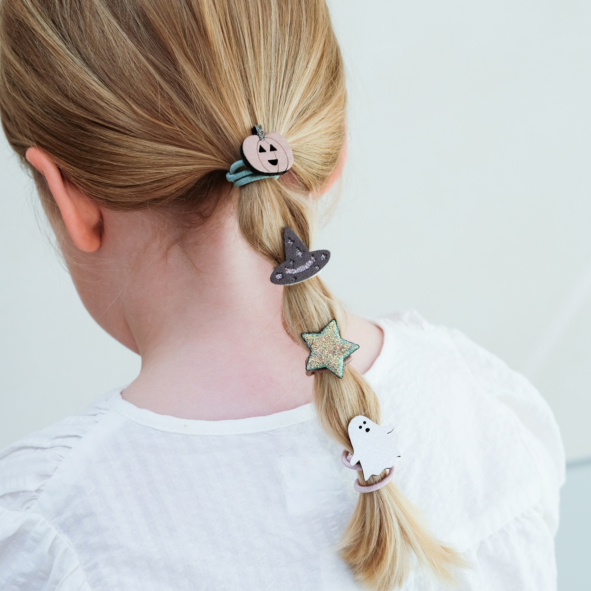 The hair is tied in sections using themed elastics decorated with cute shapes, a pumpkin, witch hat, star, and ghost.