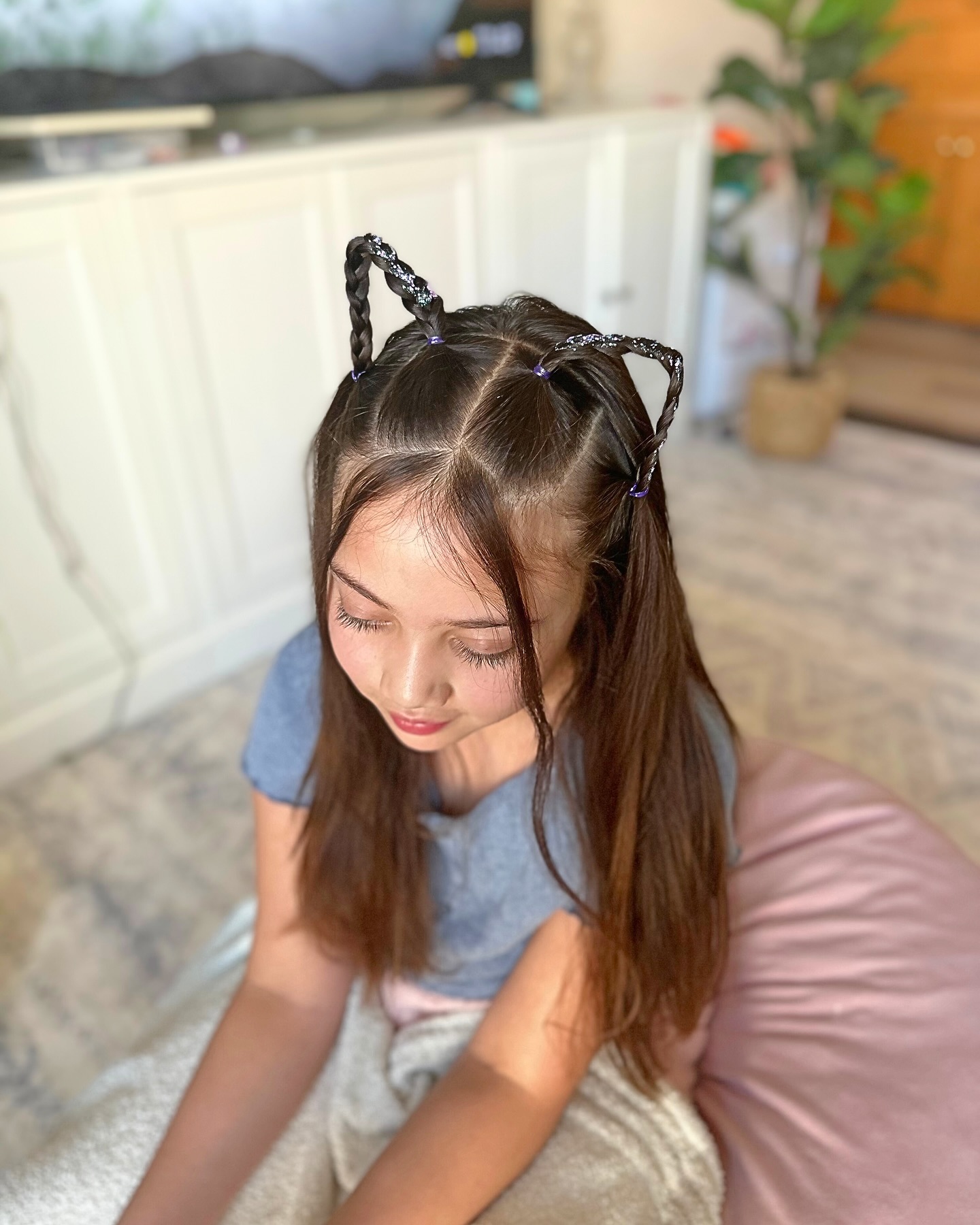 This hairstyle brings a fun twist to the classic cat-ear look using braids and a touch of sparkle.