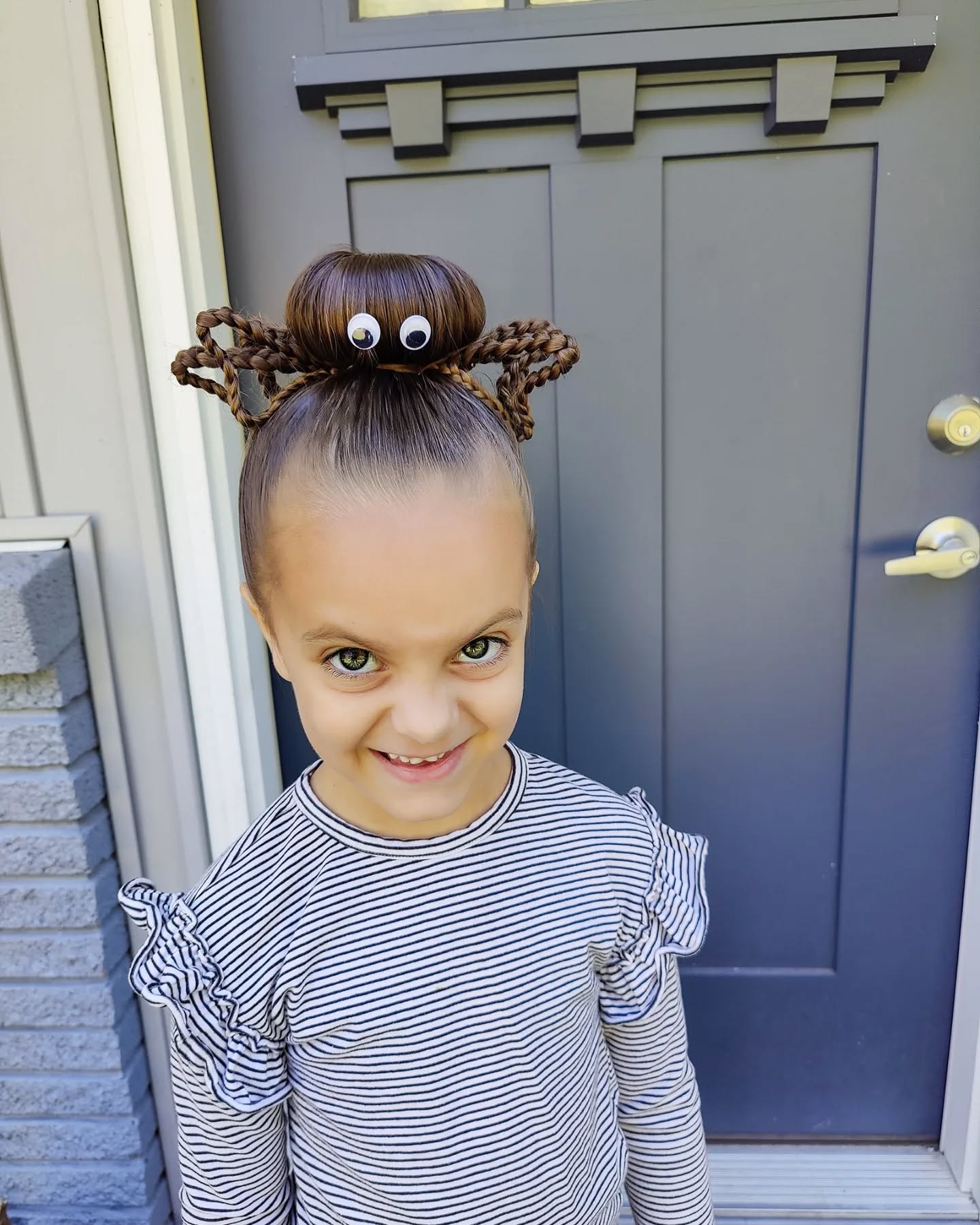 The sleek high bun forms the spider’s body, complete with googly eyes for a fun, animated look. Braided sections act as the spider’s legs, fanning out evenly on both sides to complete the design.