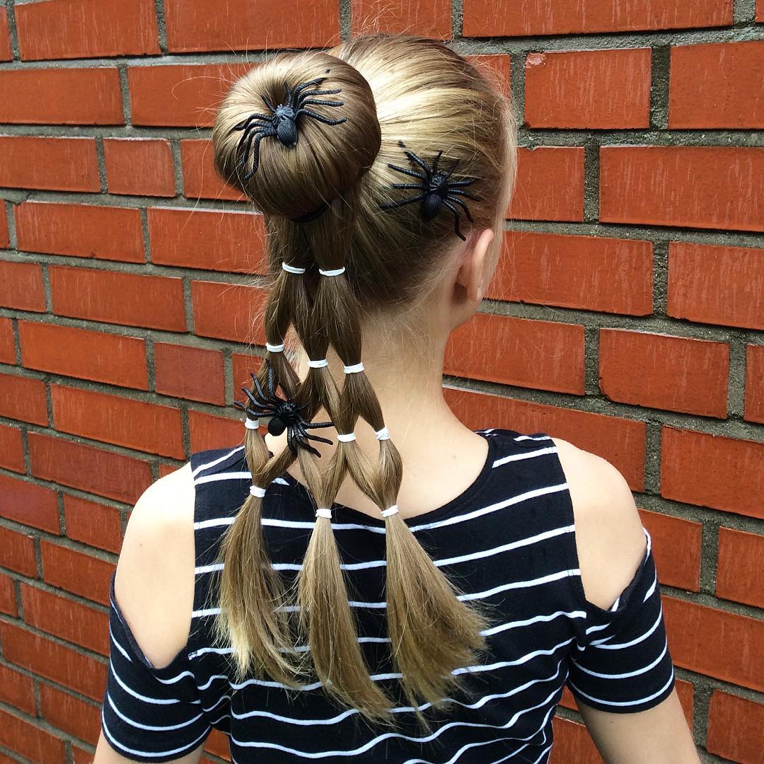 This adorable hairstyle turns a simple bun into a friendly spider.