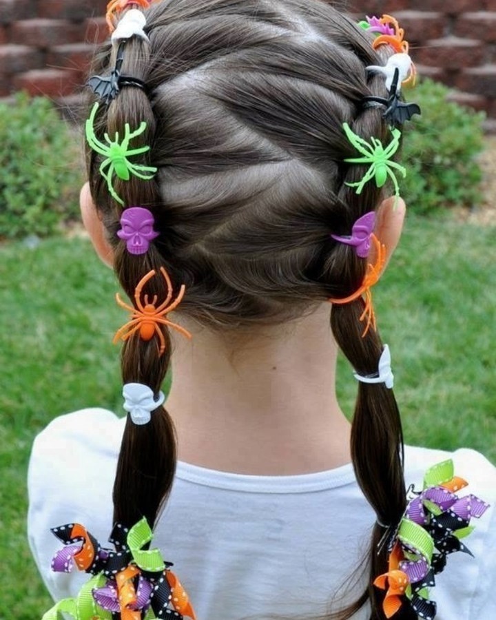 It’s a fun hairstyle that captures the spirit of Halloween and keeps hair neat for trick-or-treating adventures.