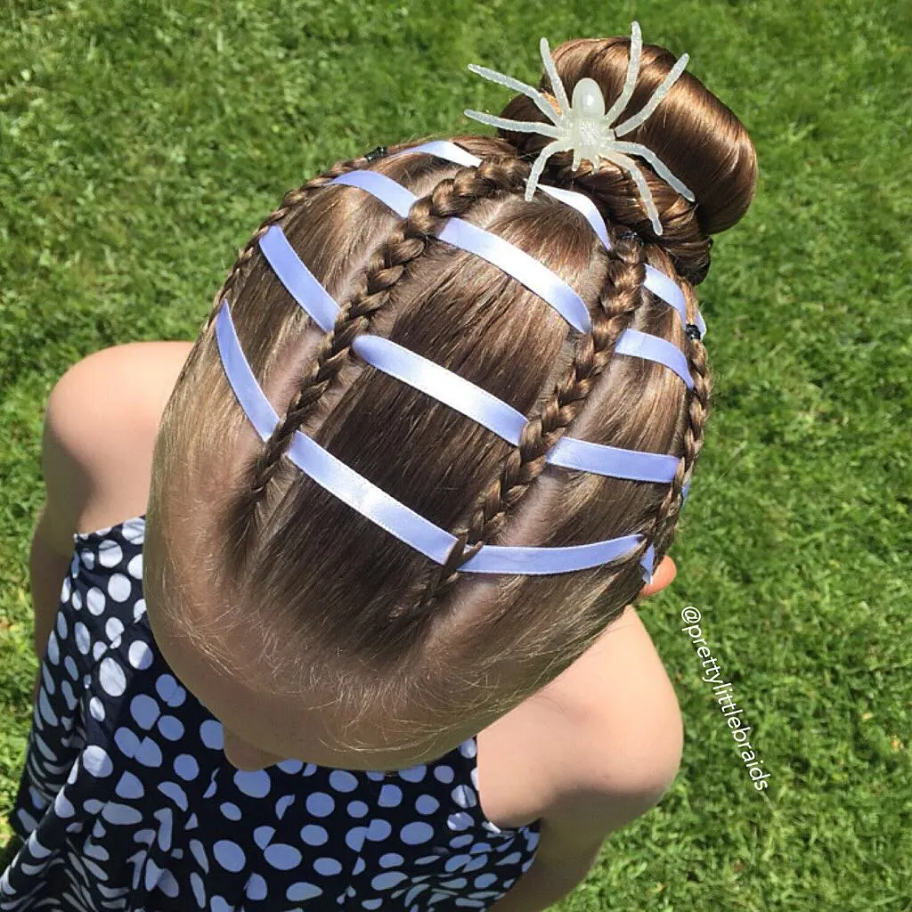 Thin braids radiate from a sleek bun at the crown, each woven with white ribbon to mimic a web pattern.