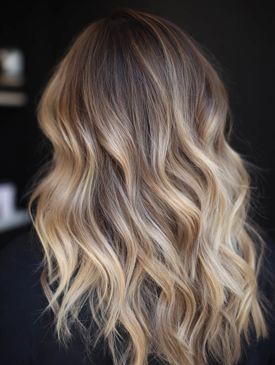 The highlights focus on the mid-lengths and ends, giving a sun-touched look that feels relaxed. This style pairs well with straight or wavy hair because the blend creates gentle movement and depth.