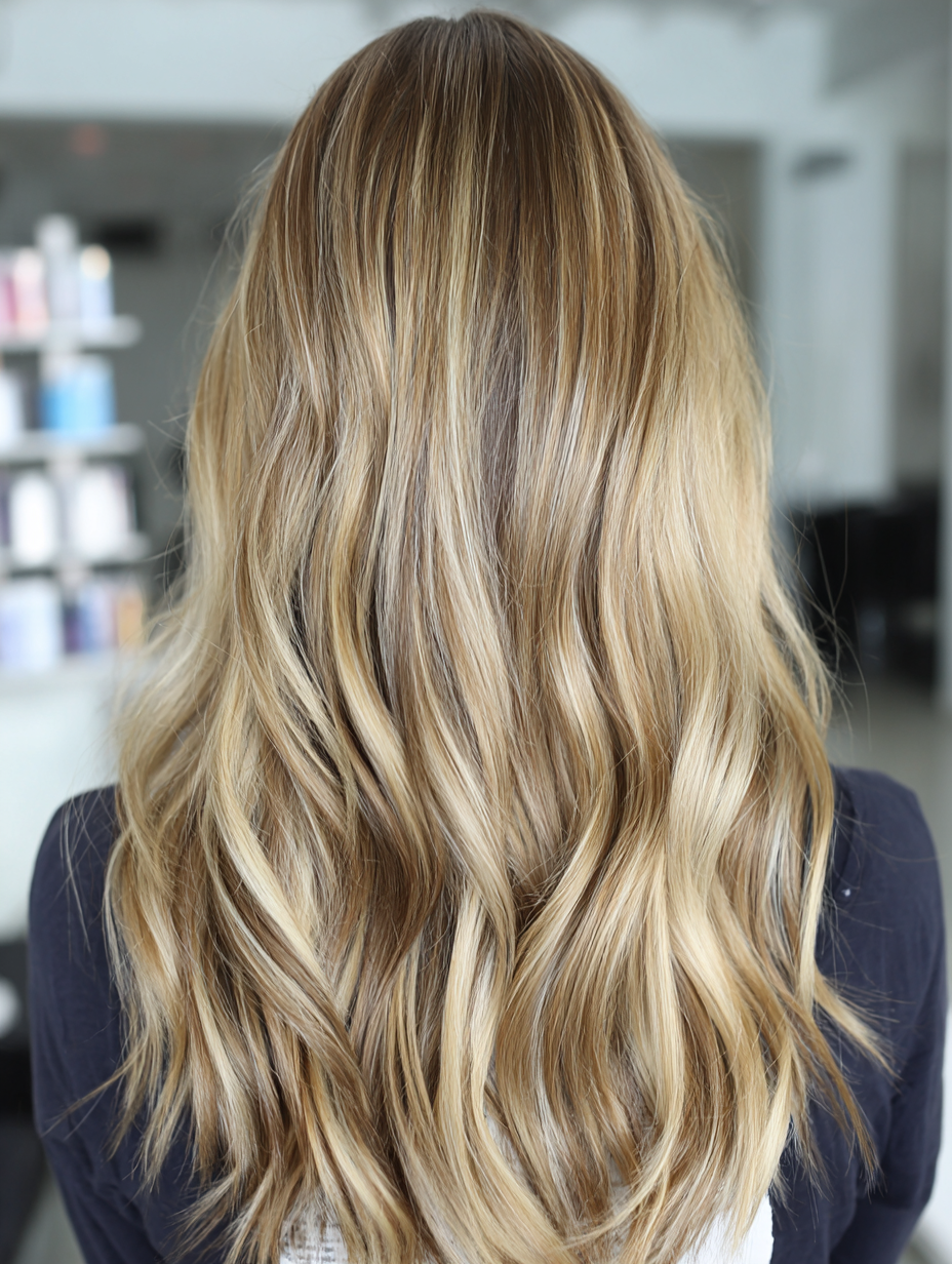 Caramel melt highlights add warm depth that blends smoothly into dirty blonde hair. The caramel tone creates a soft transition from root to tip, giving the hair an inviting glow.