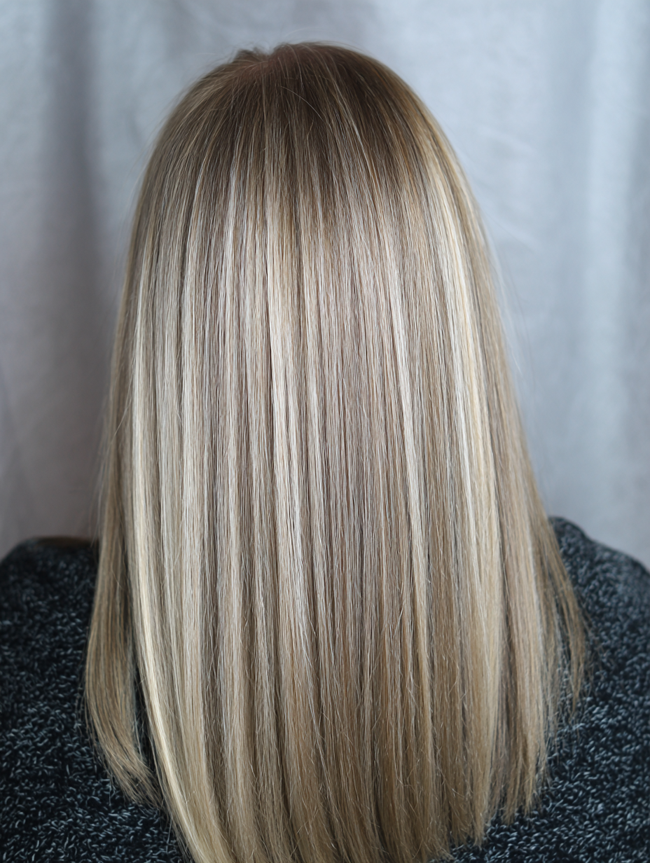 The sandy tone sits between warm and cool, creating balance without sharp contrast. These highlights lighten the mid-lengths and ends while keeping the roots grounded for easy upkeep.
