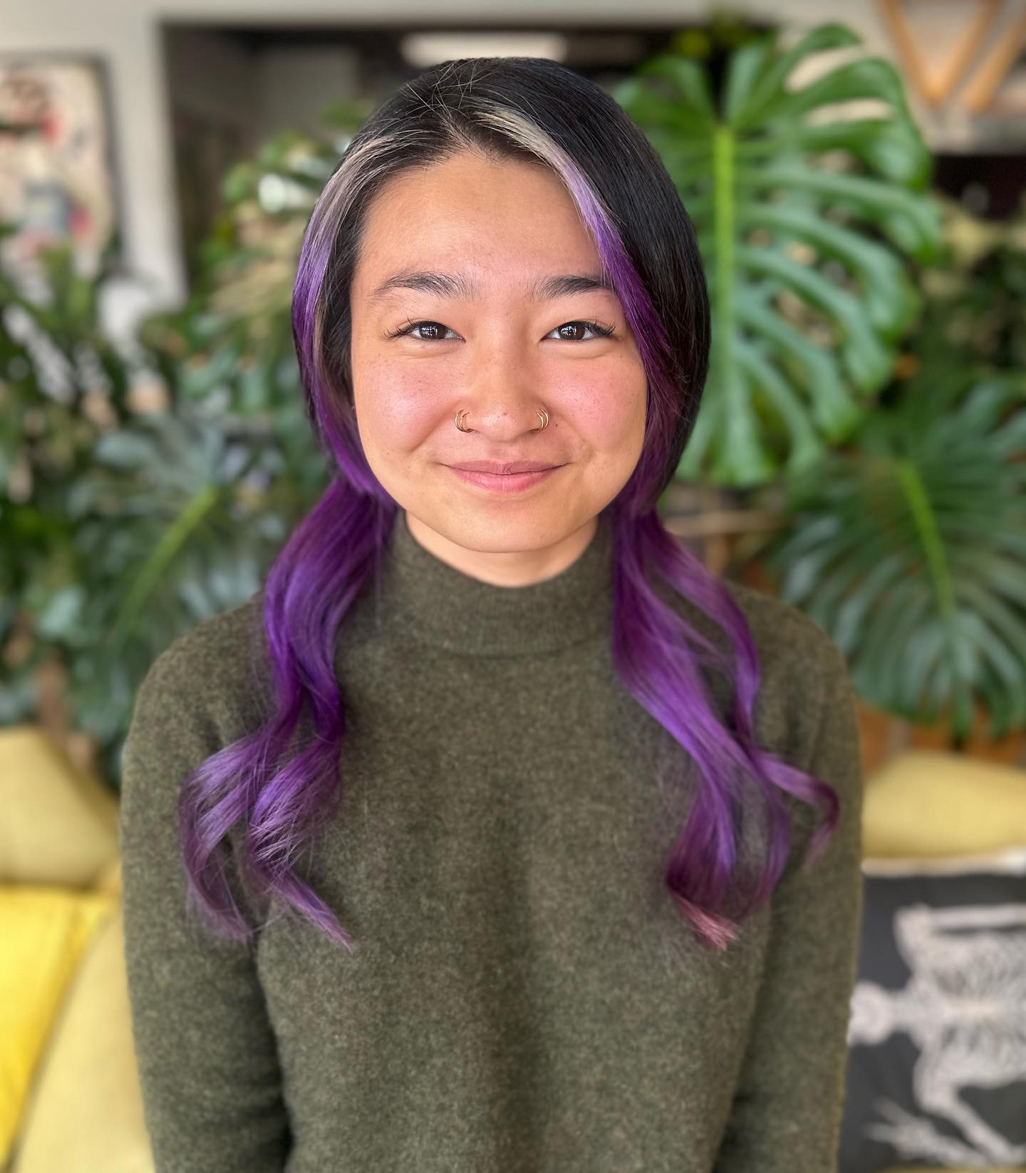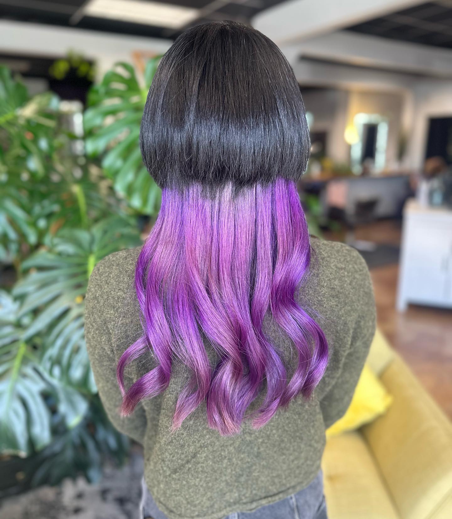 Beneath it, the longer section flows in rich purple tones, styled into soft curls that add movement and contrast.