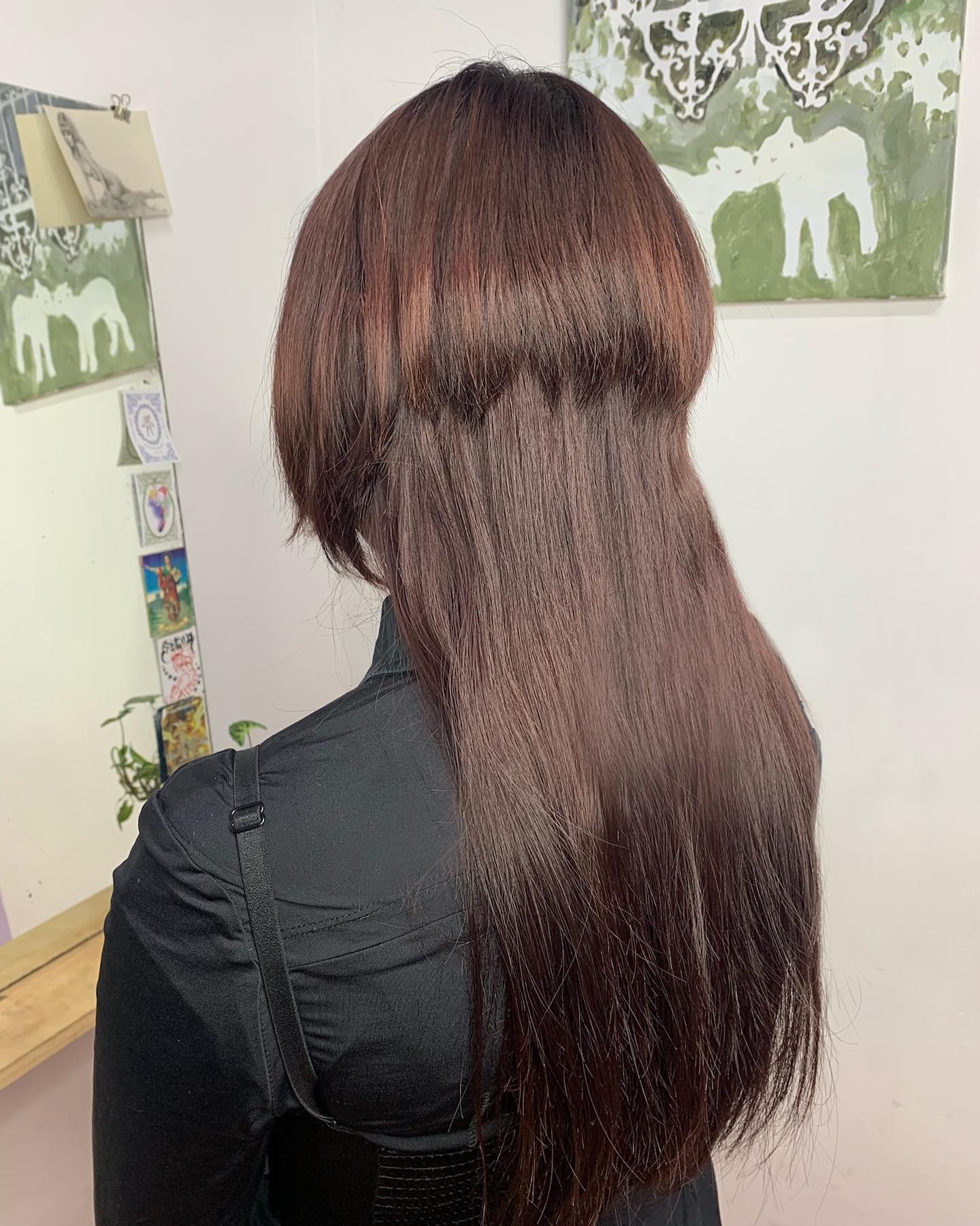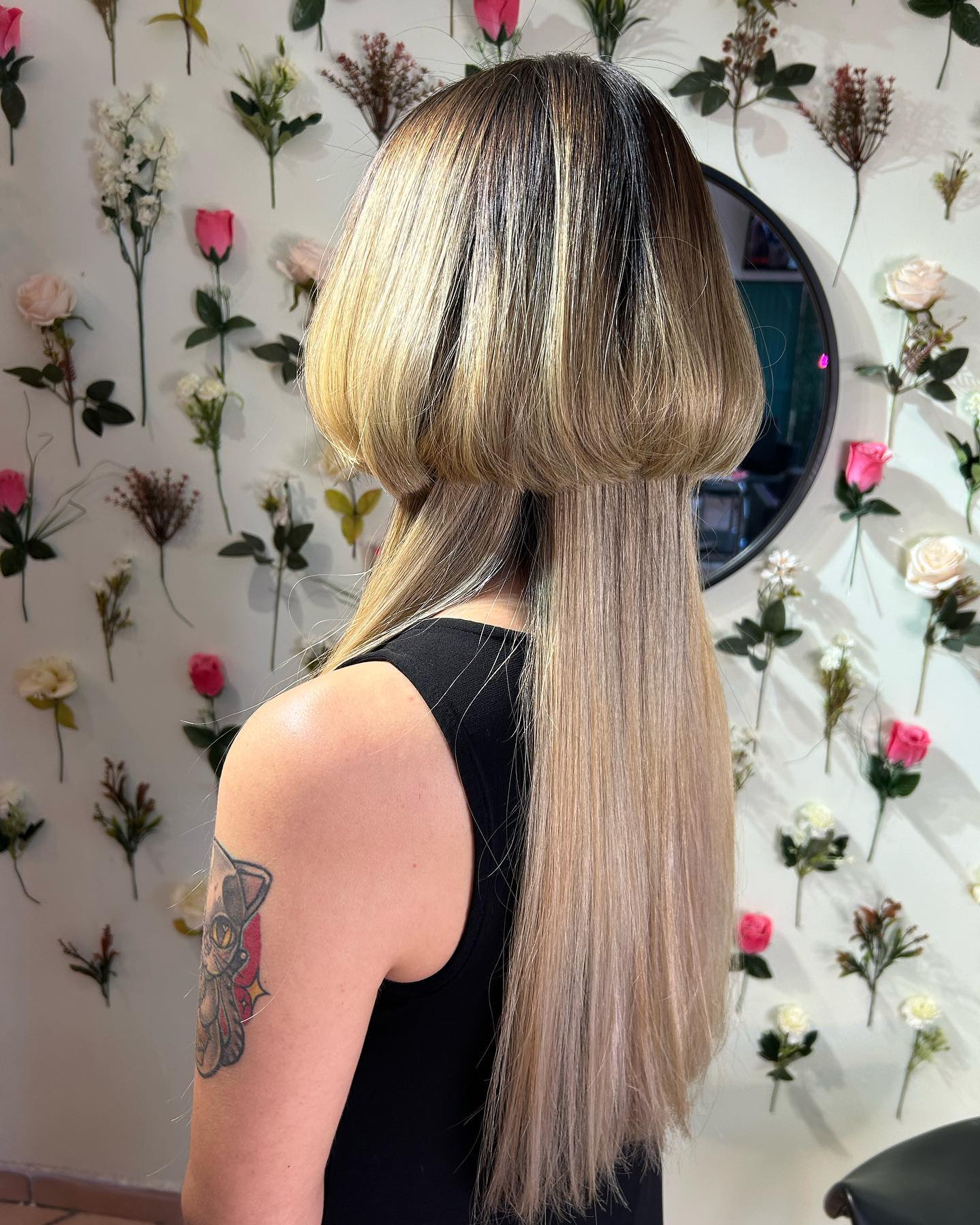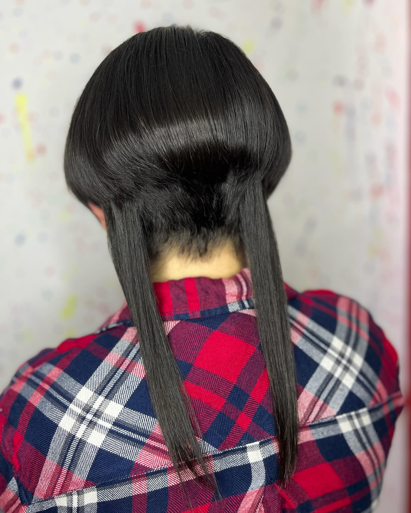 That upper layer sits clearly above the longer section, creating a strong, defined split. Underneath, the hair falls straight and sleek down the back, with even ends that add length and polish.
