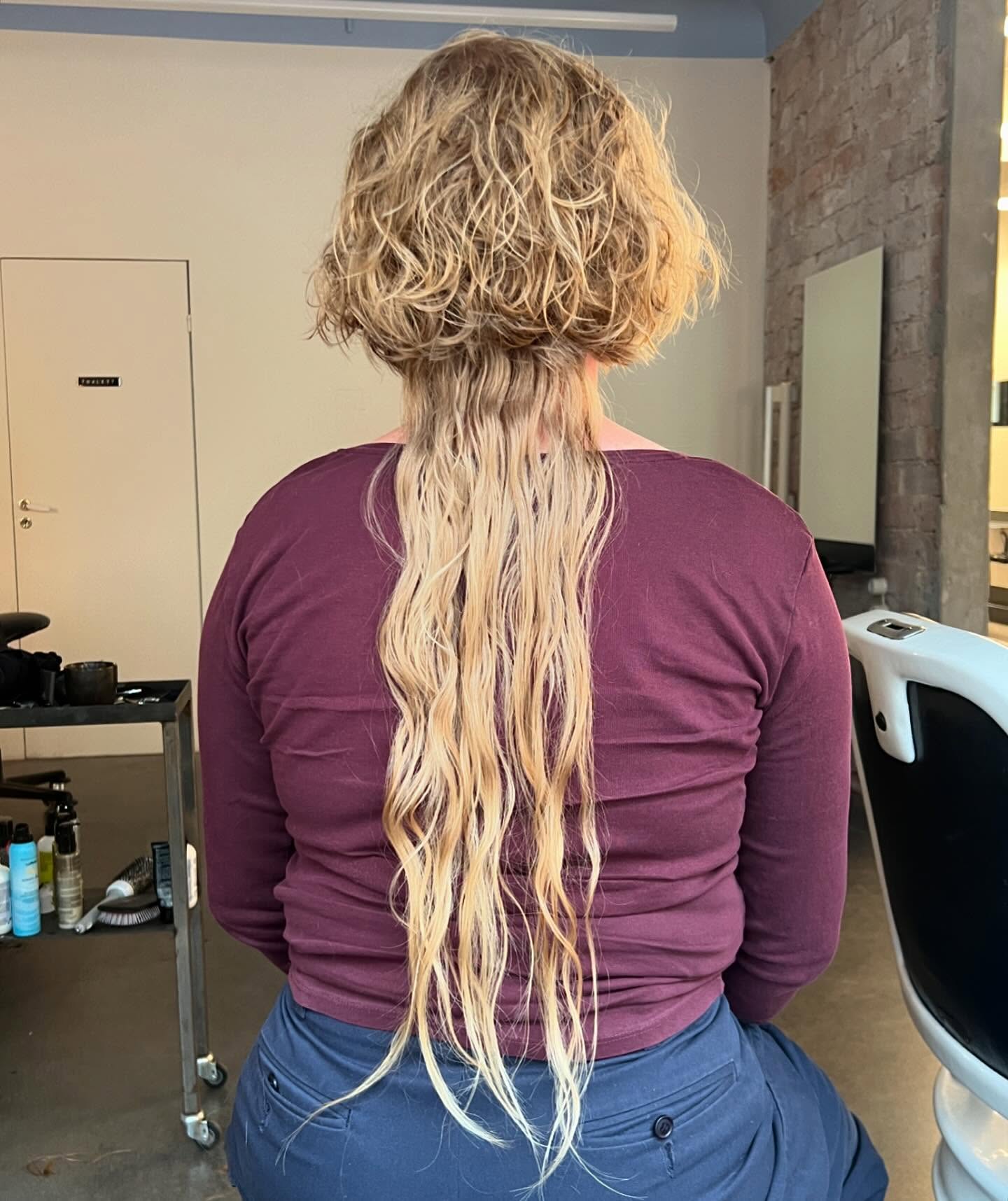 Loose waves and uneven texture keep it effortless rather than structured. Beneath it, long, straightened blonde sections fall in thinner, tapered strands, creating a clear contrast in both length and texture.