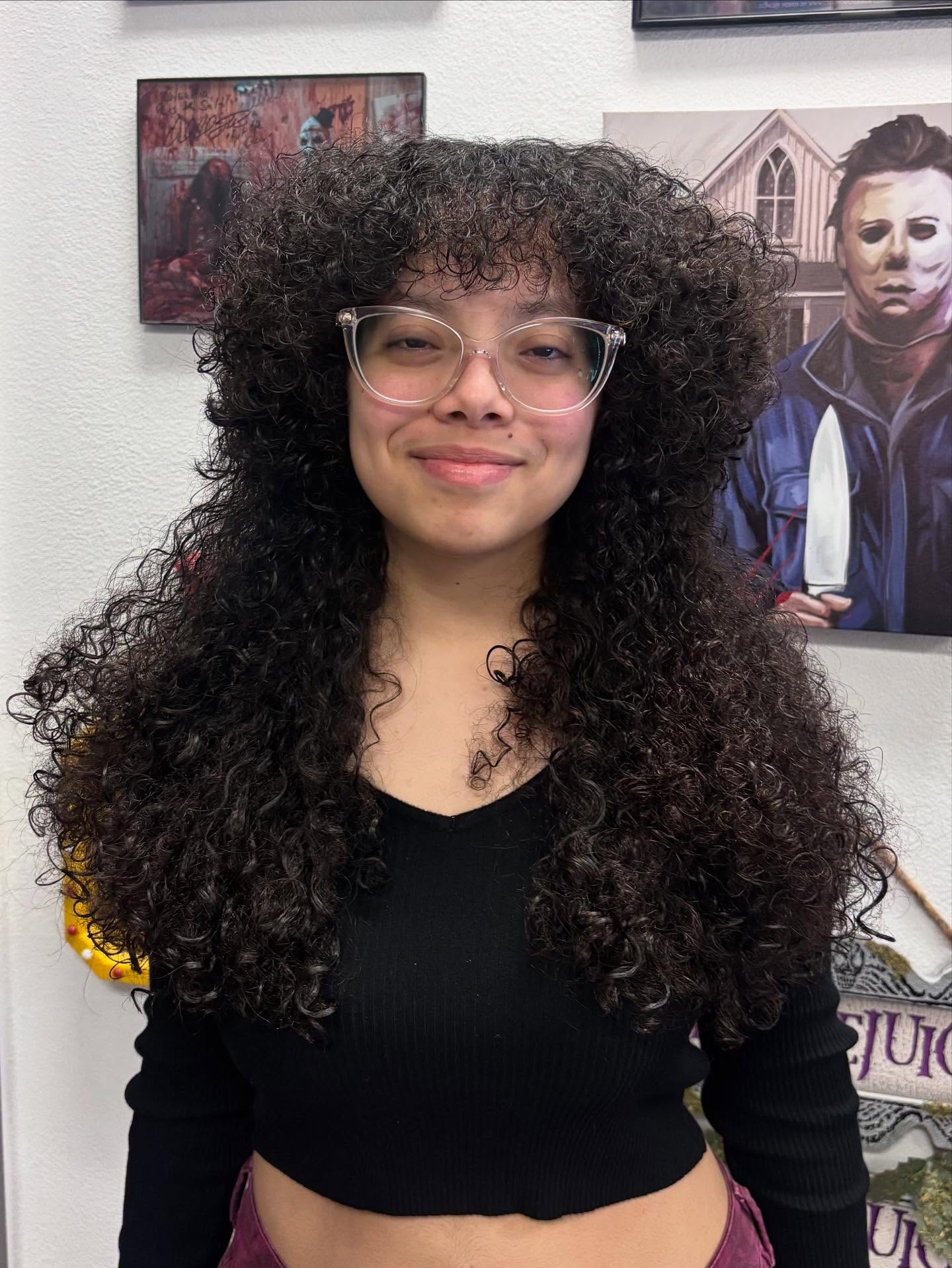 Curly bangs blend softly into the sides, keeping the front balanced and natural. Underneath, longer curls fall past the shoulders, creating contrast and length.