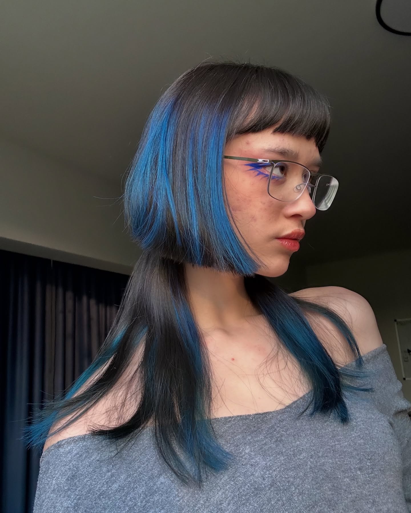 Deep blue streaks run through the darker base, adding depth and drawing attention to the layered cut. Beneath, the longer section falls in straight, separated strands that extend past the shoulders.