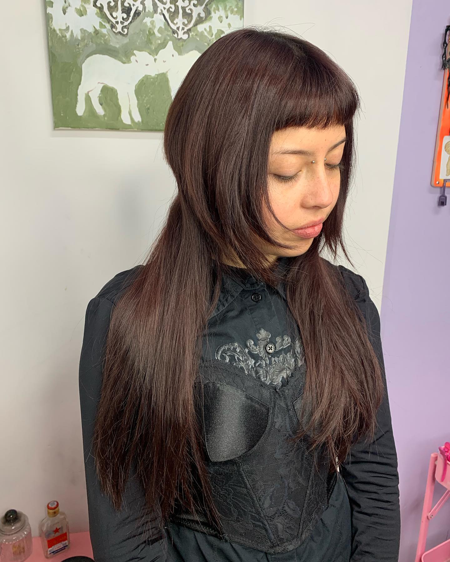 Short, straight bangs sit across the forehead, adding structure without feeling heavy. Beneath, the longer section falls straight and smooth past the shoulders, creating a clear layer contrast.