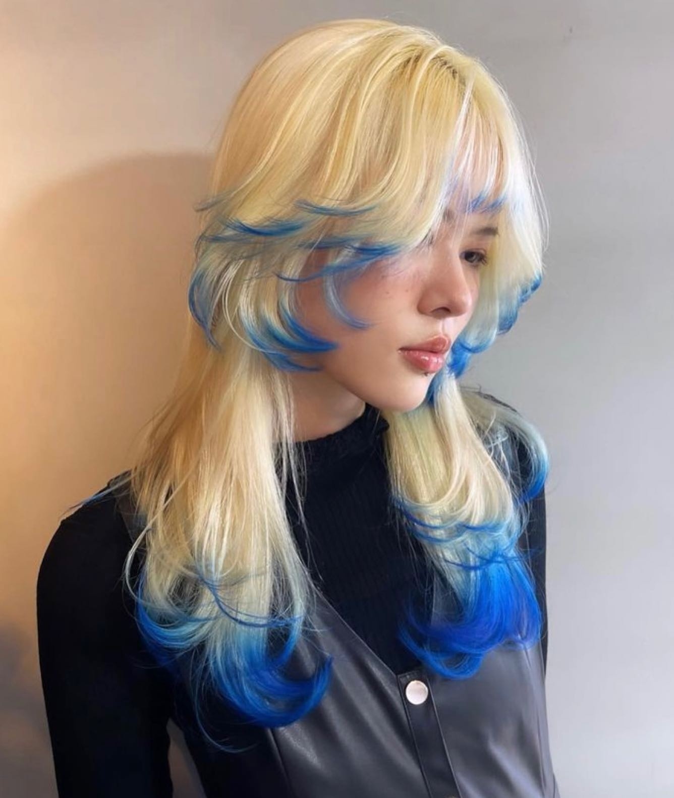 Wispy bangs fall forward, keeping the look relaxed and slightly undone. Beneath, longer strands extend past the shoulders, with vivid blue tips adding depth and dimension.