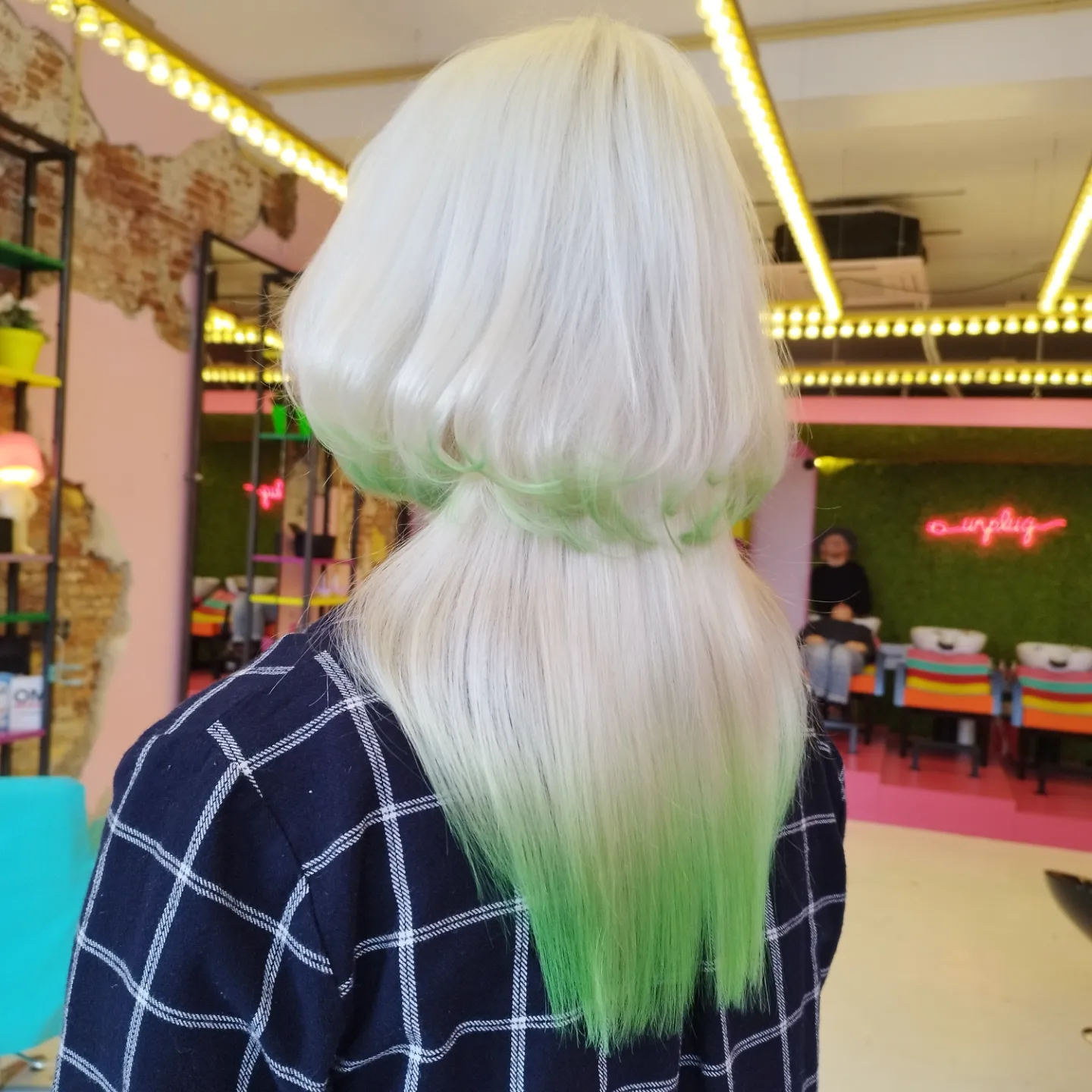 Beneath, the longer section fades into a gentle green ombre, adding contrast without overpowering the style.