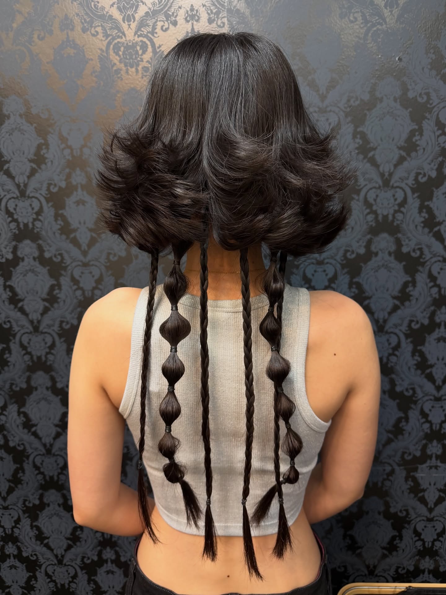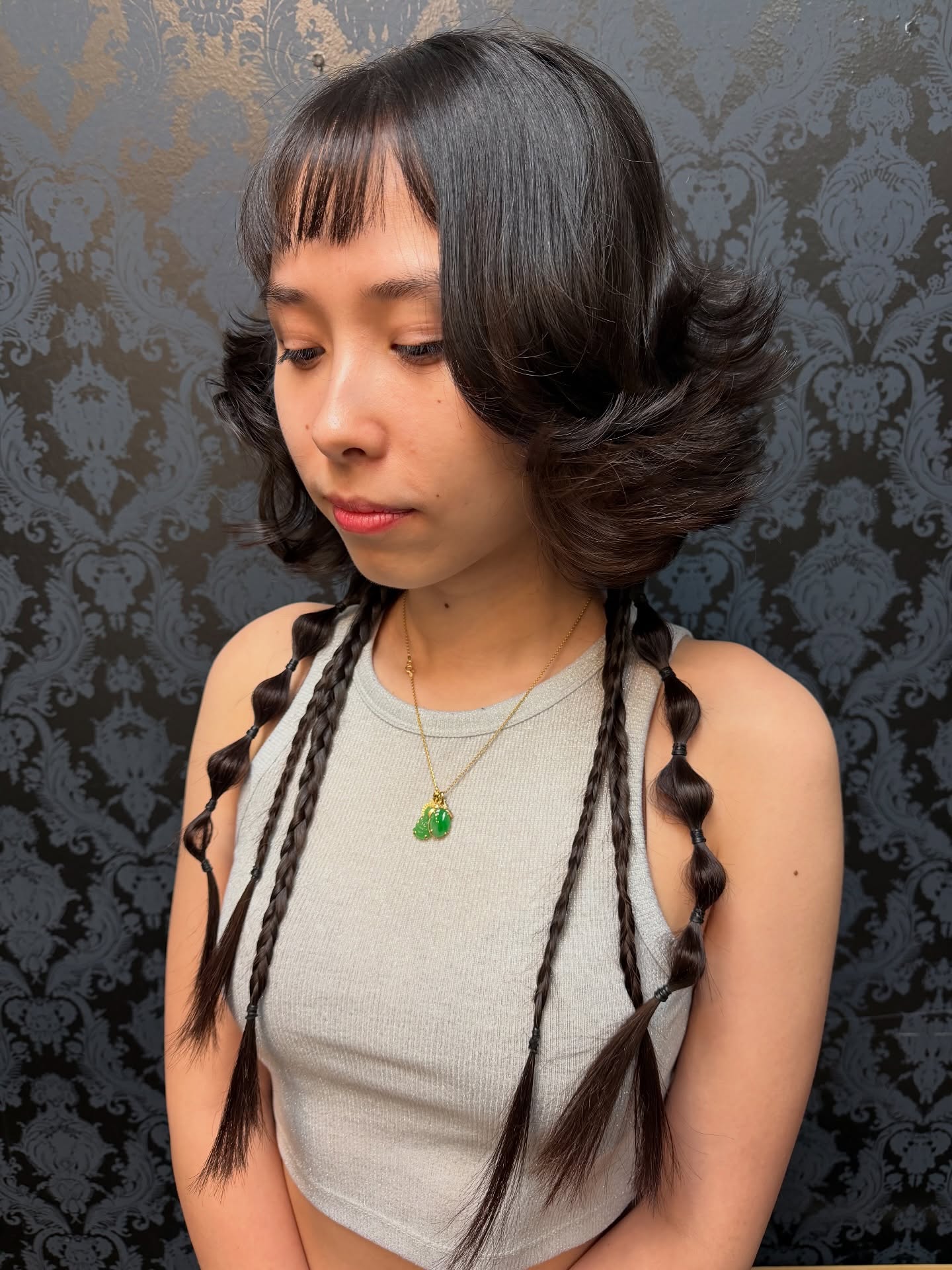 Long curtain bangs blend into the bob and keep the front relaxed. Beneath, the lower layer gets styled into a single bubble braid, adding texture and a fun twist to the cut.