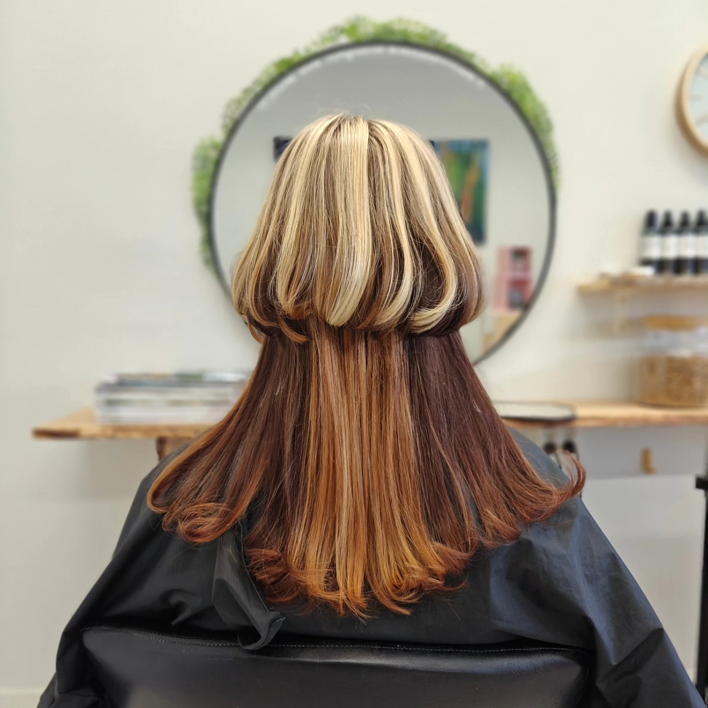 Underneath, the longer section shifts into warm caramel tones, falling past the shoulders with soft, tapered ends.