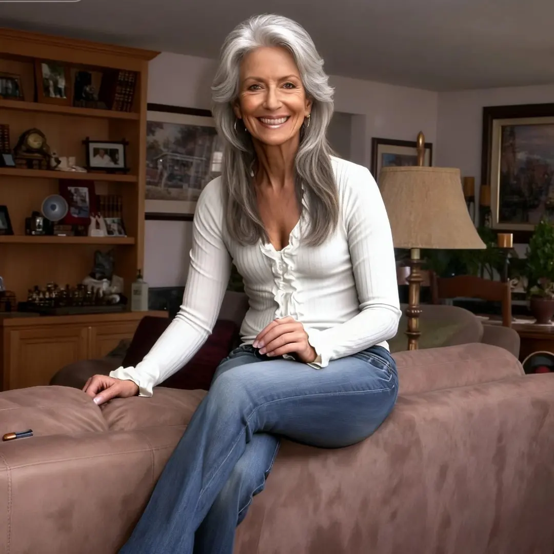 A few silver strands blend in beautifully, adding a touch of authenticity and confidence. The natural part keeps the look casual yet striking.