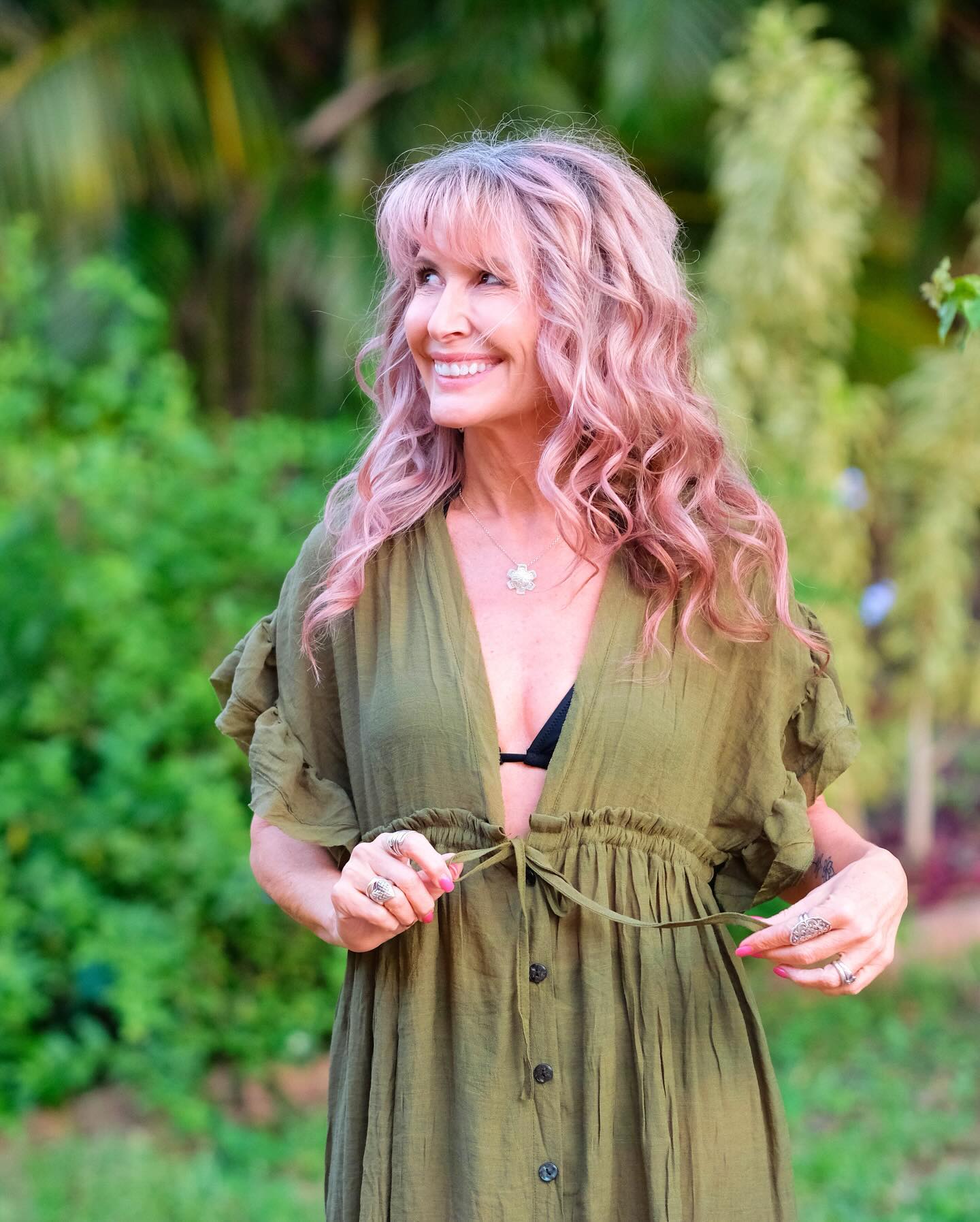 Light bangs soften the forehead and blend seamlessly into the curls for a cohesive finish. The delicate pink tones enhance brightness and complement a sun-kissed complexion.