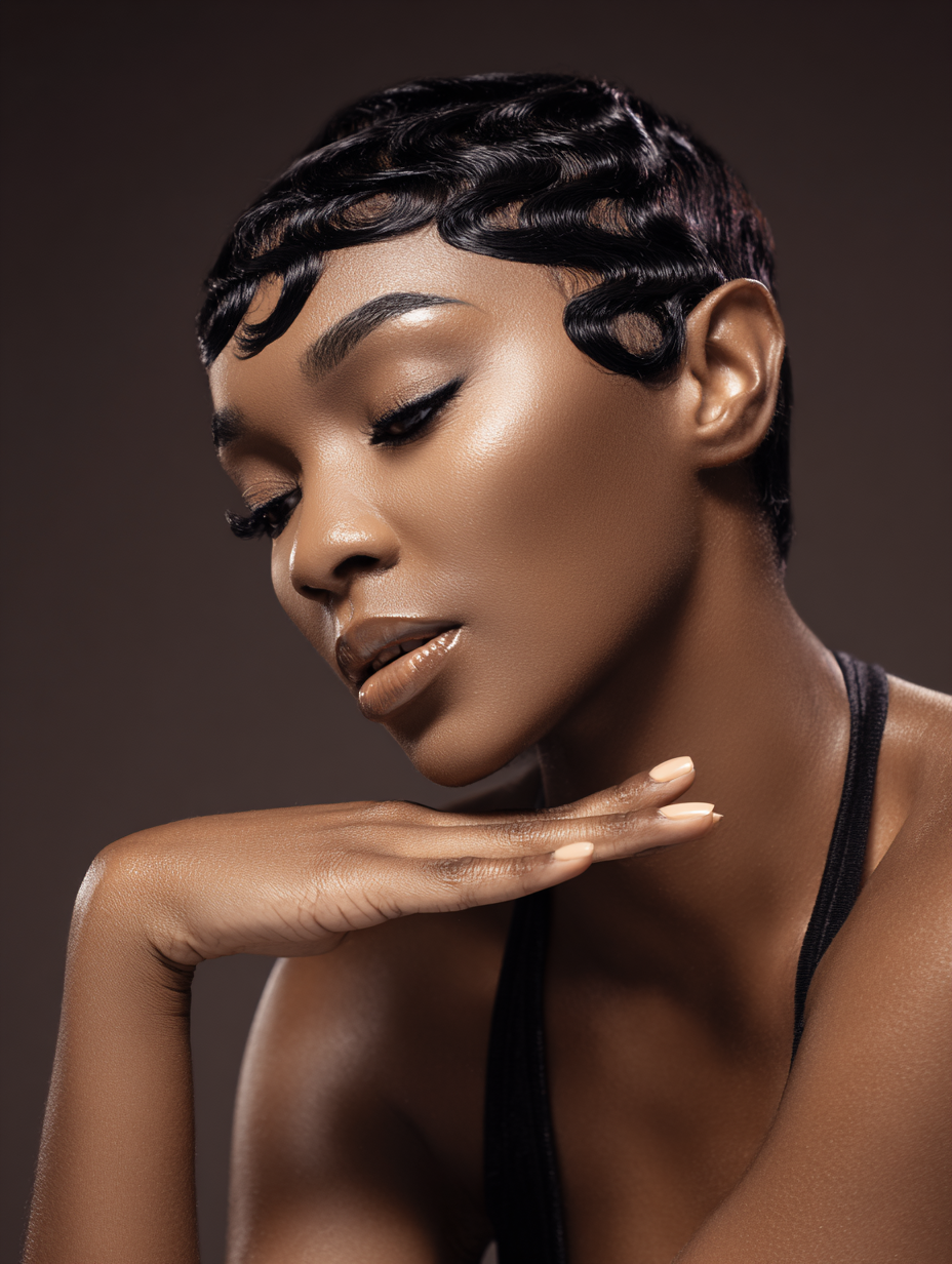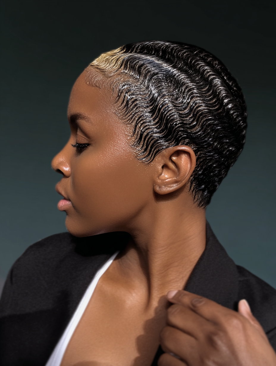 Defined finger waves bring classic glamour to a low cut, offering texture that instantly elevates the style.