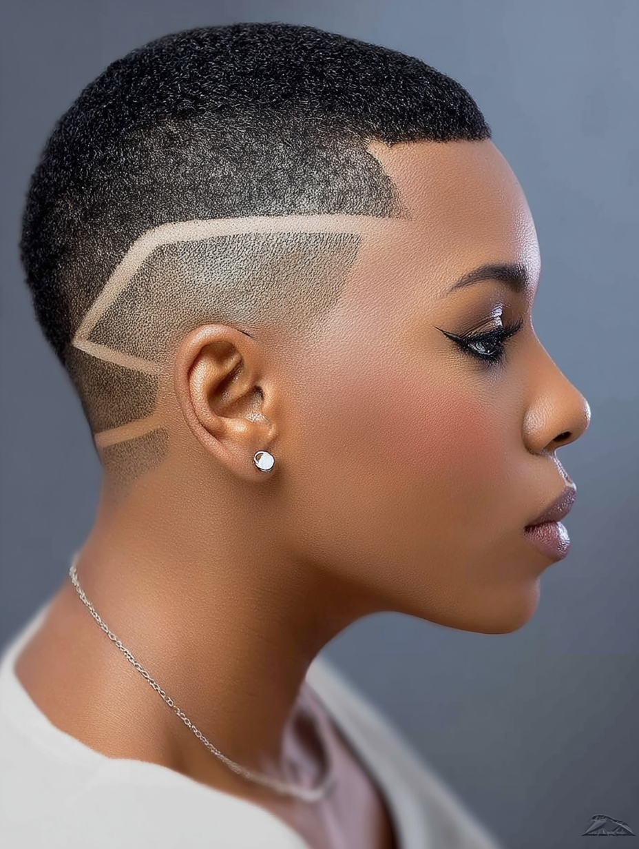 This buzz cut with a soft edge up gives a neat, polished finish that looks strong and feminine.