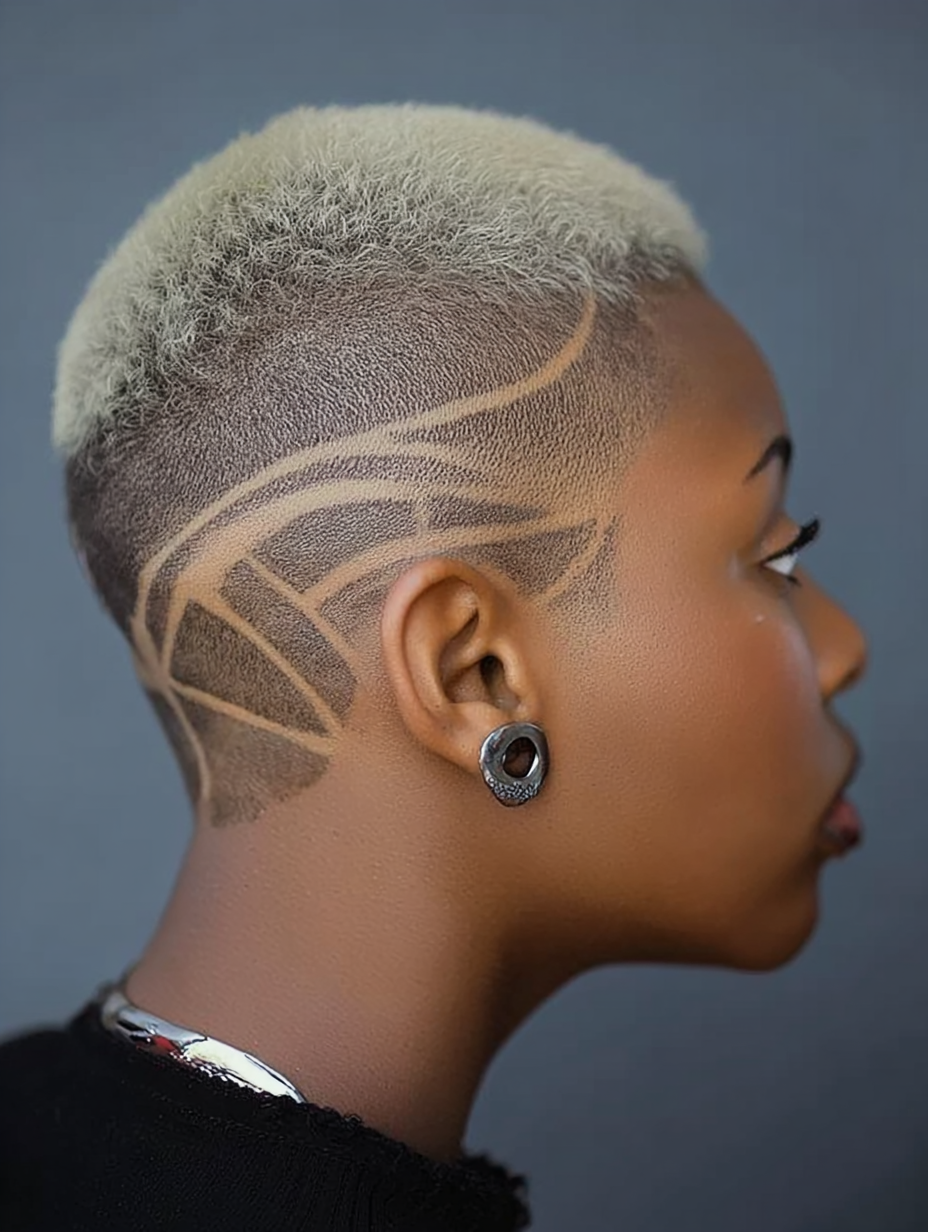 Low cuts with shaved patterns show creativity on the scalp, transforming hair into a canvas.