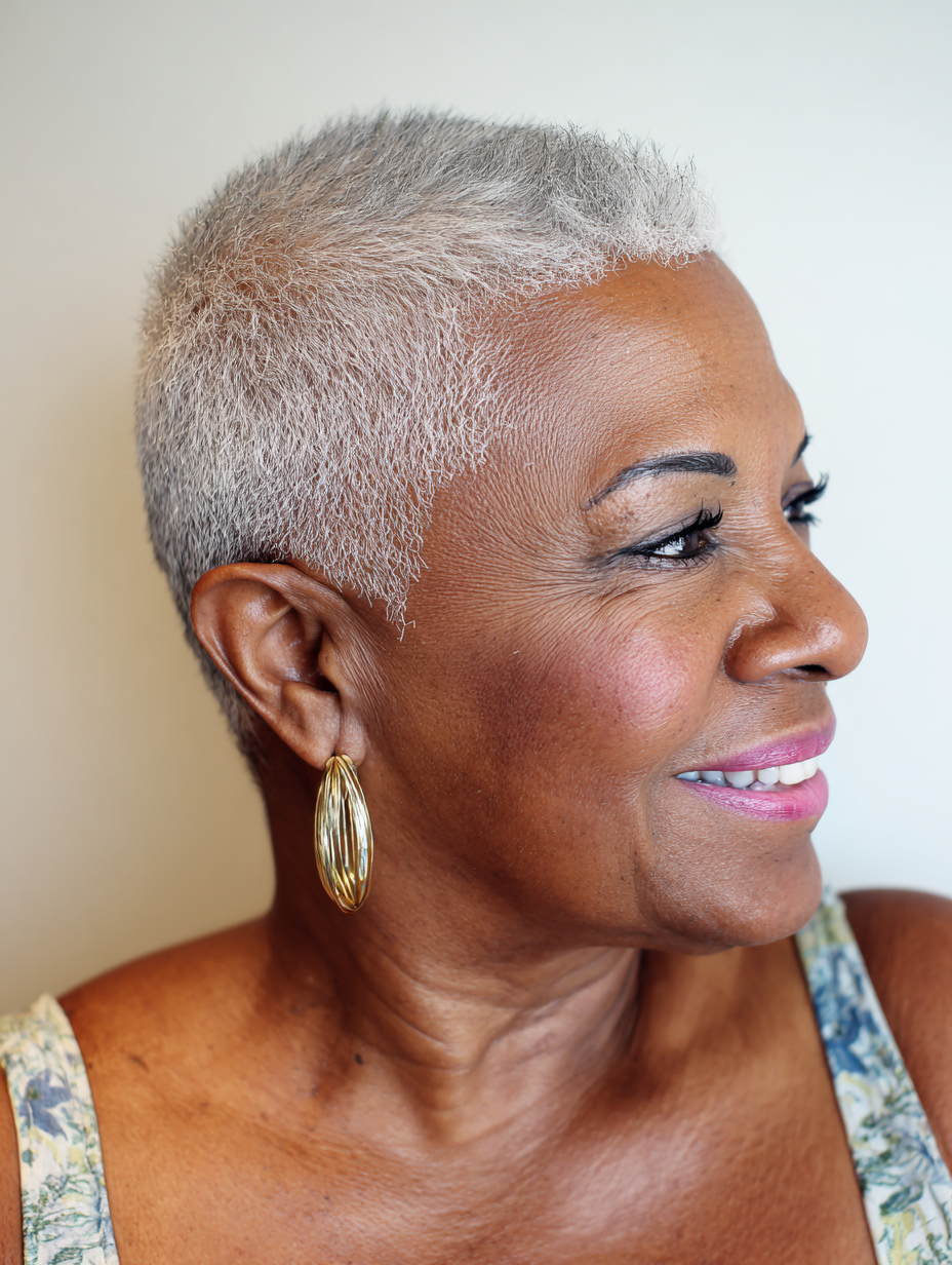 With hair cropped closely, gray strands shimmer instead of hiding, becoming a statement of style rather than age. Hydrating serums help keep gray hair soft, supporting a healthy texture.