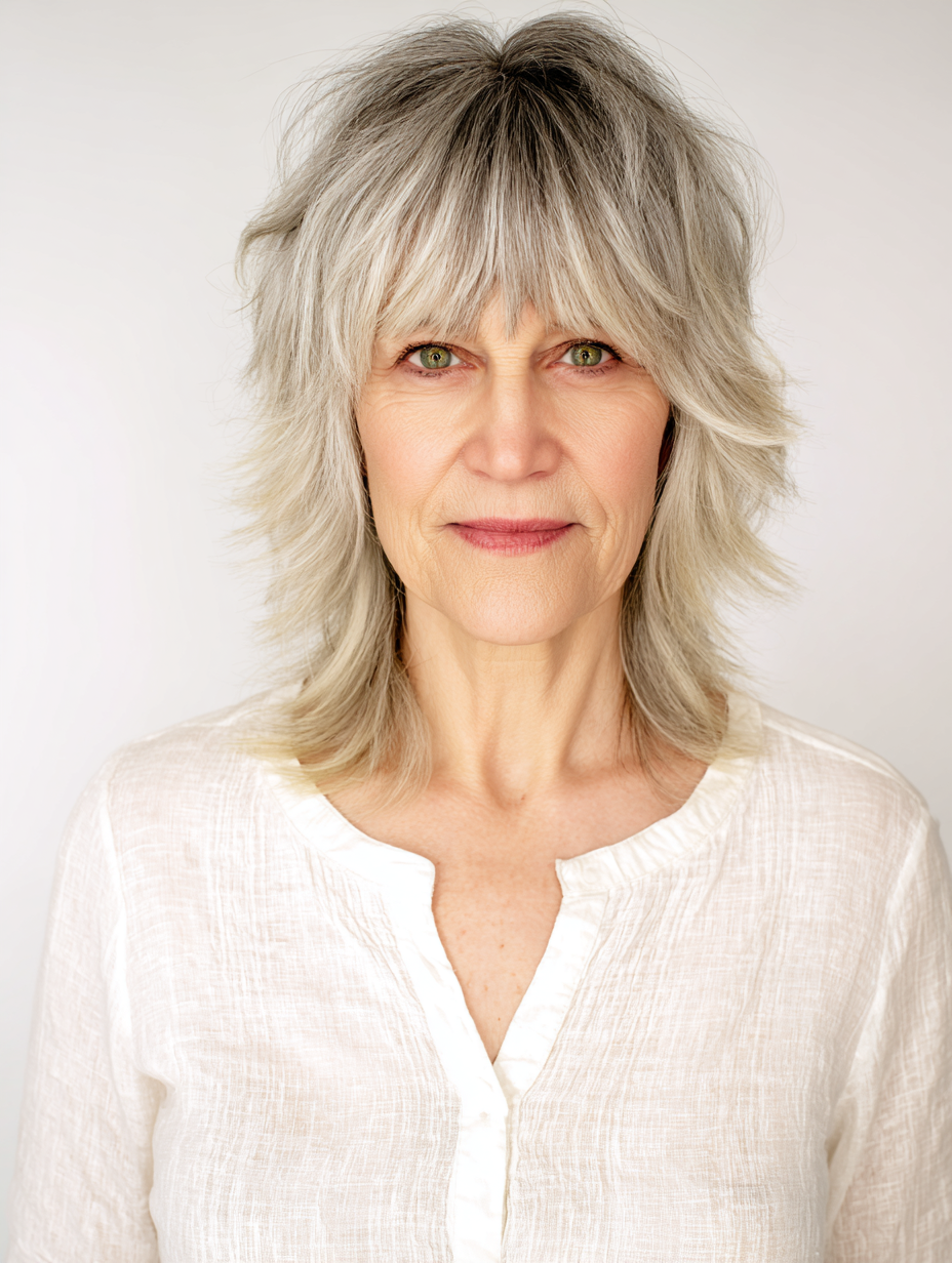 This cut flatters mature features gently. It suits women who want an easy hairstyle with movement. Maintenance remains simple with routine trims to refresh the feathering.