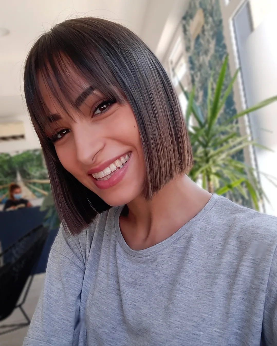 Wispy bangs soften the front and draw attention to the eyes without looking heavy. The ends look thick and precise, which helps the style appear full and structured.