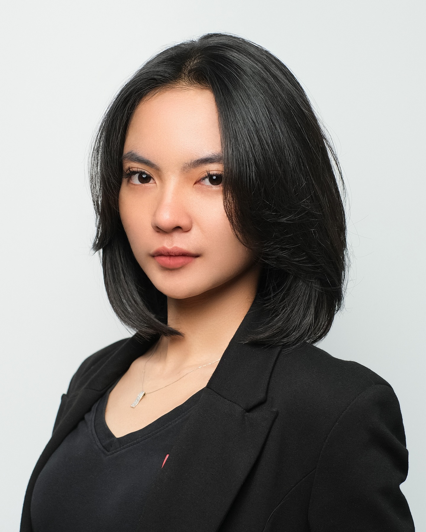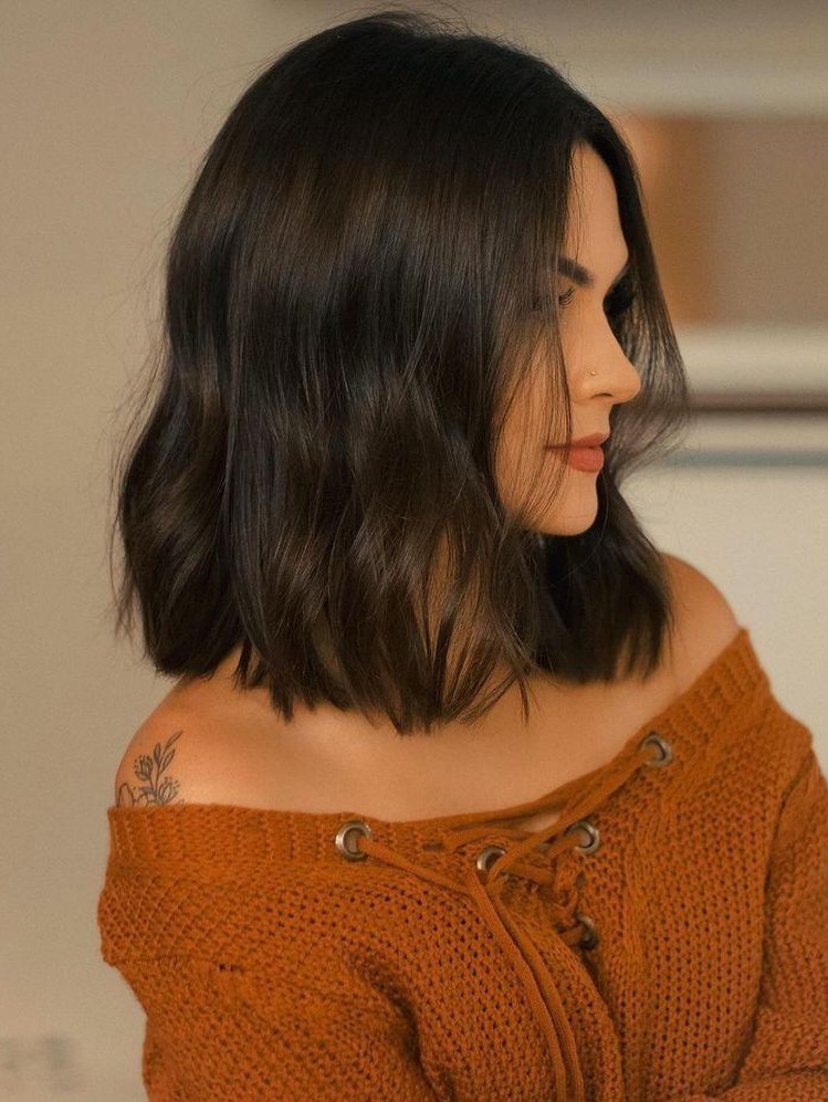 This layered medium bob hairstyle sits just above the shoulders and creates a soft, balanced silhouette.