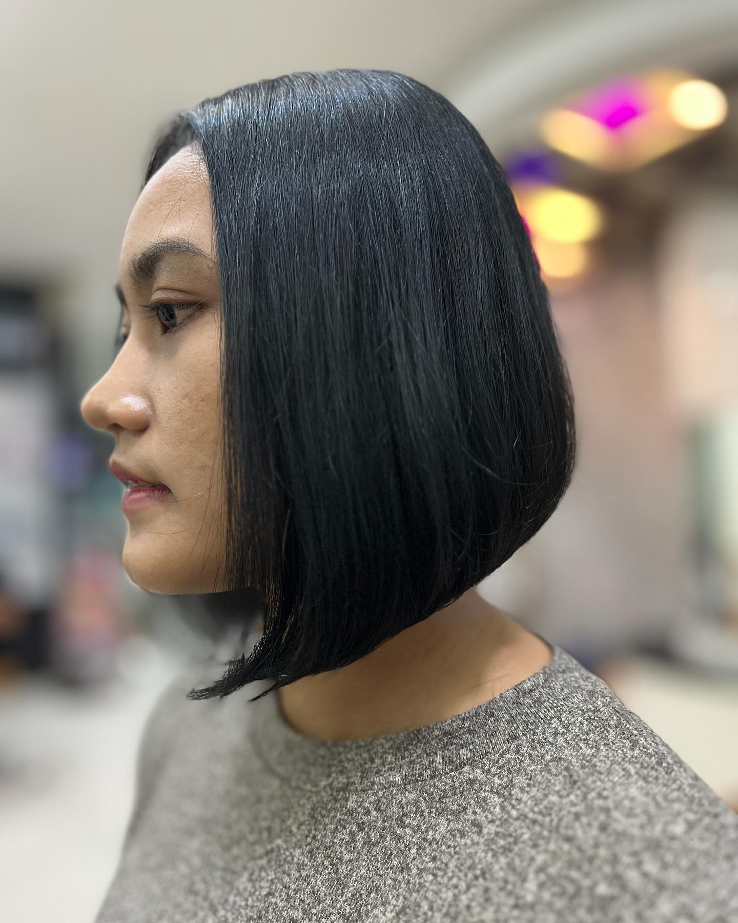This sleek medium bob hairstyle features a smooth angled shape that becomes slightly longer toward the front.