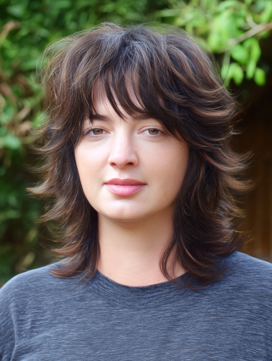 A shoulder-length shag brings gentle texture without pushing hair outward at the sides. The soft layers sit high enough to add lift at the crown, which subtly lengthens the overall silhouette.