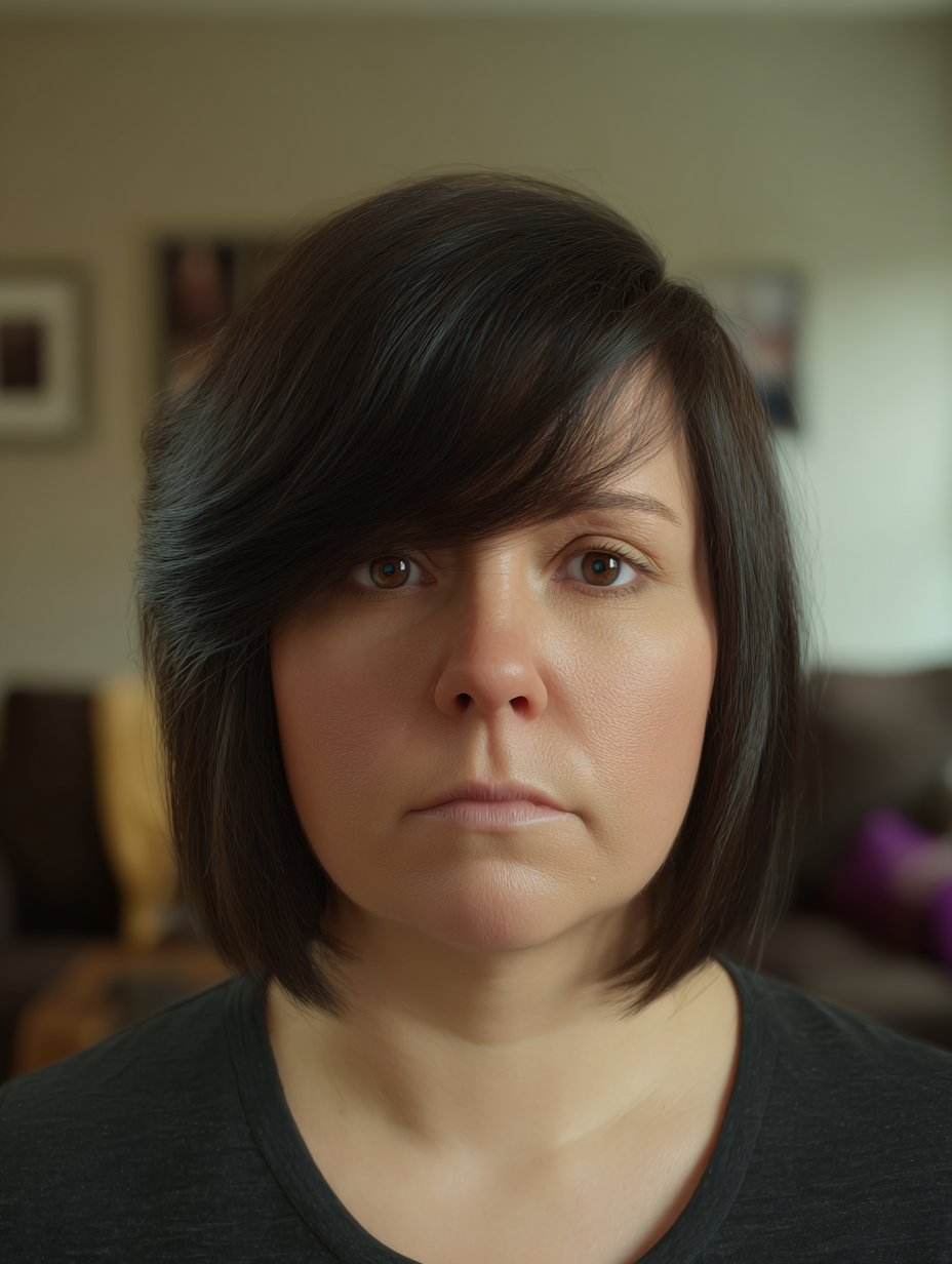 A medium cut with long sideswept bangs creates a diagonal line that visually lengthens the face. The bangs blend into the rest of the cut, so they don’t feel separate.