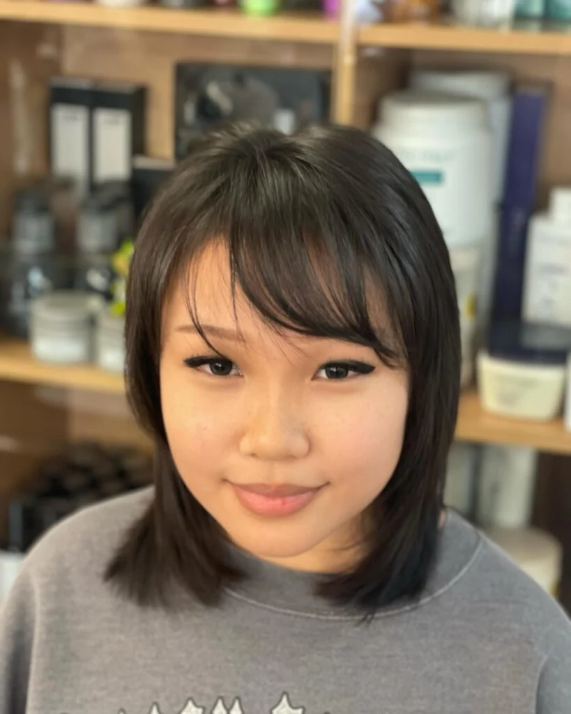 Wispy bangs sweep slightly to the side, drawing attention to the eyes without feeling heavy. The layers help frame the jawline gently, offering balance for fuller face shapes.