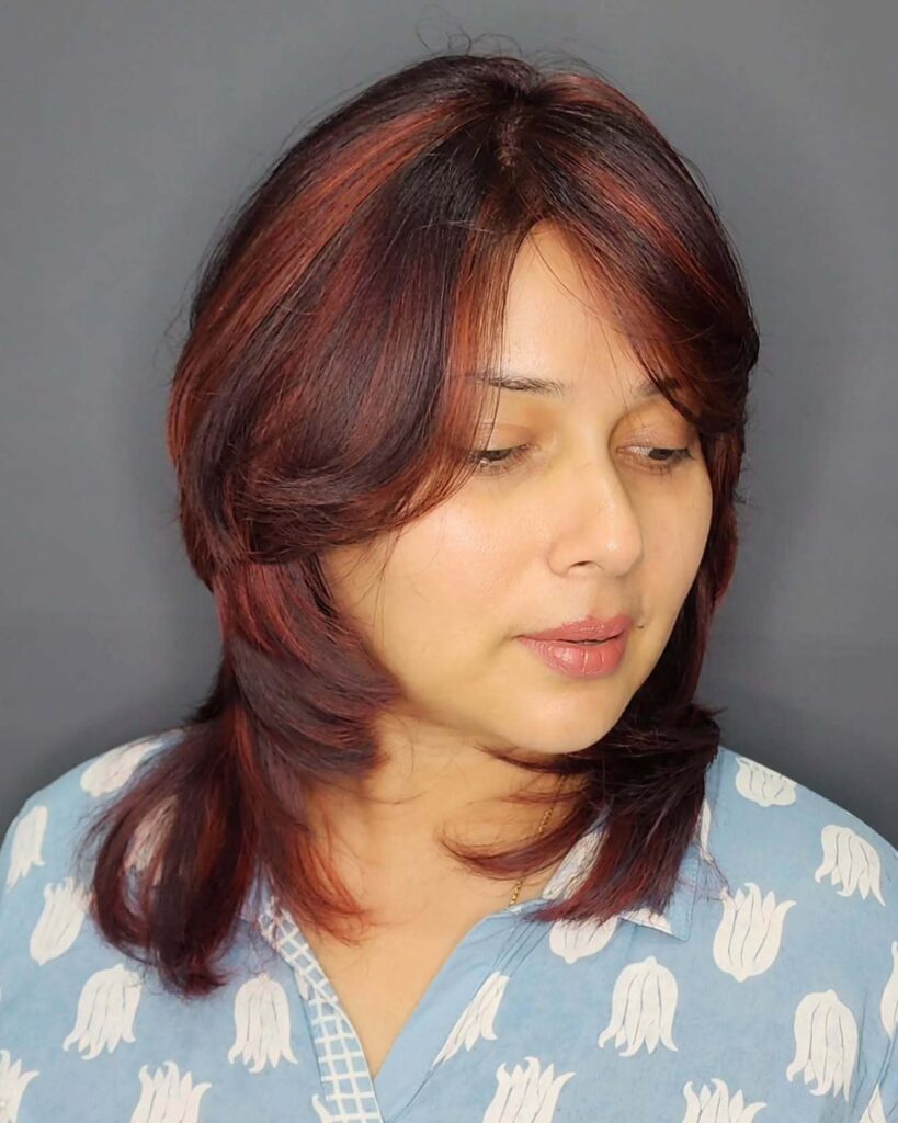 The layers are styled to curve inward, creating softness while keeping the overall look structured. Subtle red highlights enhance depth and shine, blending seamlessly with the darker base for a warm finish.