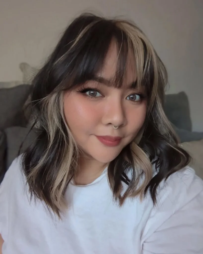 Wispy bangs fall lightly across the forehead, blending seamlessly with the highlighted sections. The wavy texture keeps the style relaxed and modern while balancing volume around the face.