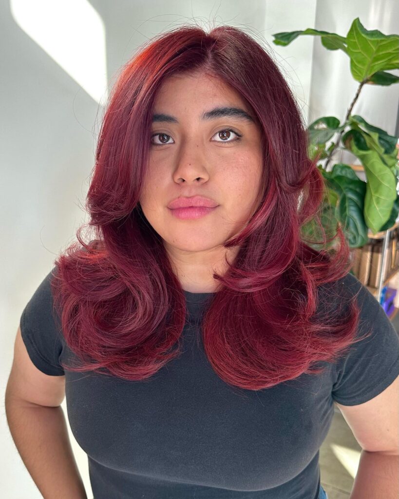 This hairstyle features medium to long auburn hair styled with soft, cascading layers that add fullness and shape.
