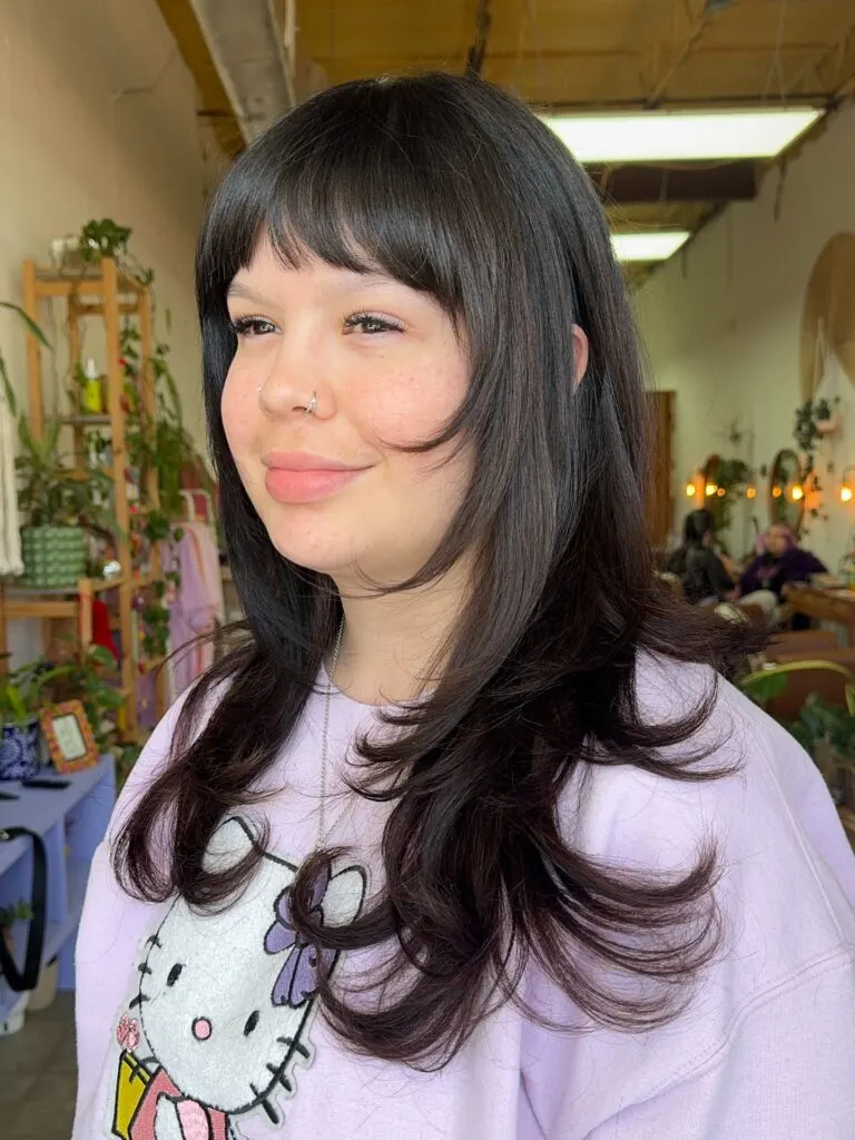 Wispy bangs sweep slightly to the side, drawing attention to the eyes without feeling heavy. The layers help frame the jawline gently, offering balance for fuller face shapes.