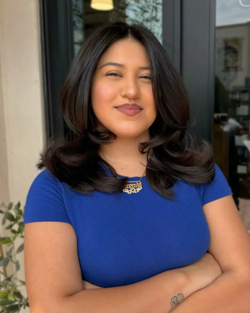 This hairstyle features medium-length dark hair styled with voluminous layers that flip outward for movement and fullness.