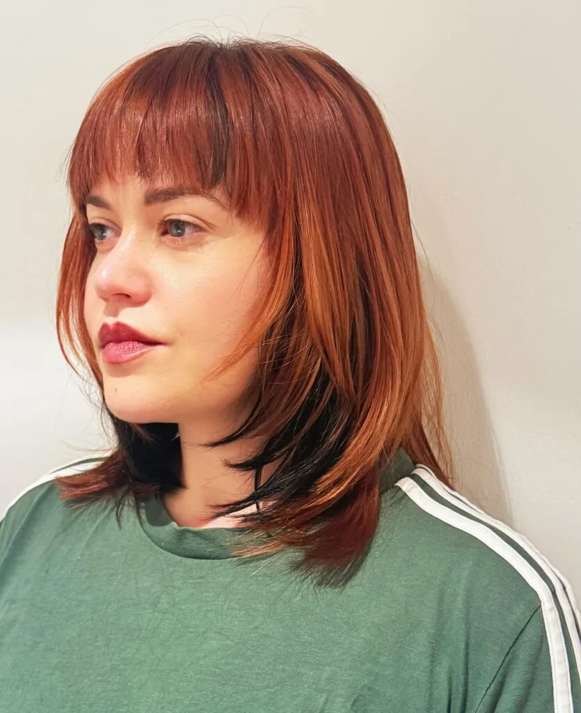 This hairstyle features a rich copper tone that brings warmth and vibrancy to the medium-length cut. Full bangs frame the forehead evenly, adding structure while drawing attention to the eyes.
