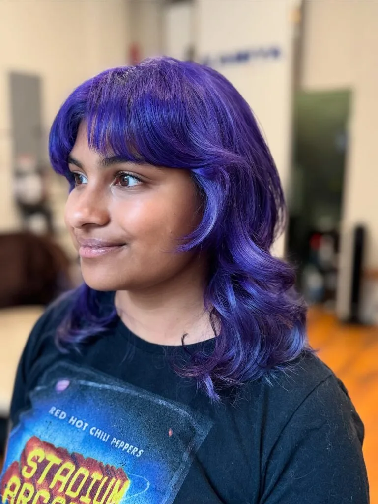 This hairstyle features medium-length hair styled with soft waves that add body and bounce to the look. The vibrant purple color makes the style bold, while the layered cut keeps it light and manageable.