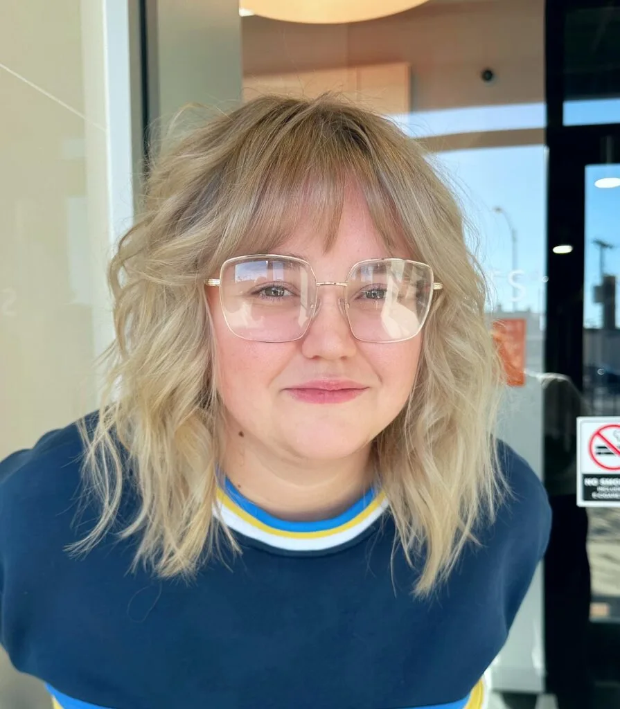 Choppy bangs frame the forehead naturally, blending with the layered waves for a soft, casual look. The textured cut adds volume and body, making it flattering for fuller face shapes without feeling too heavy. The messy, undone style works perfectly for everyday wear, offering a relaxed and effortless vibe.