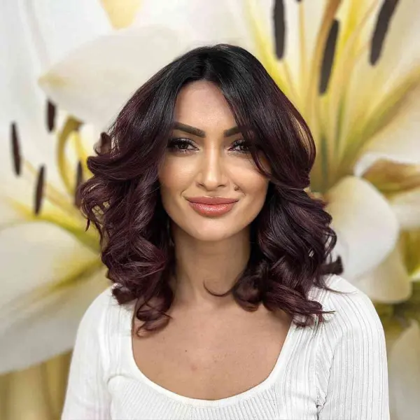This medium hairstyle features rich burgundy curls that sit neatly around the shoulders, adding volume and bounce.