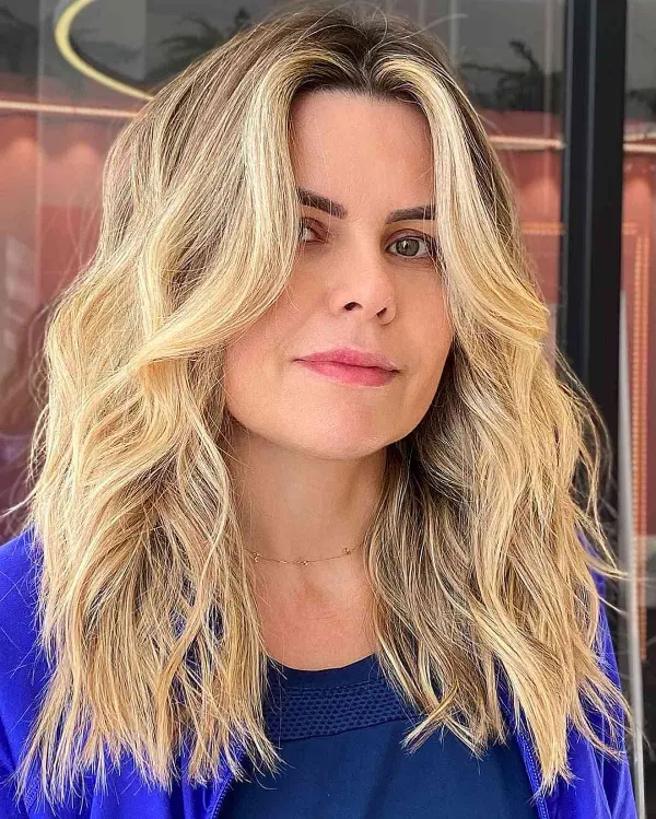 Blonde highlights blended with a darker base add depth and brightness, enhancing the tousled waves. This cut works especially well for square faces, as the waves soften strong angles.