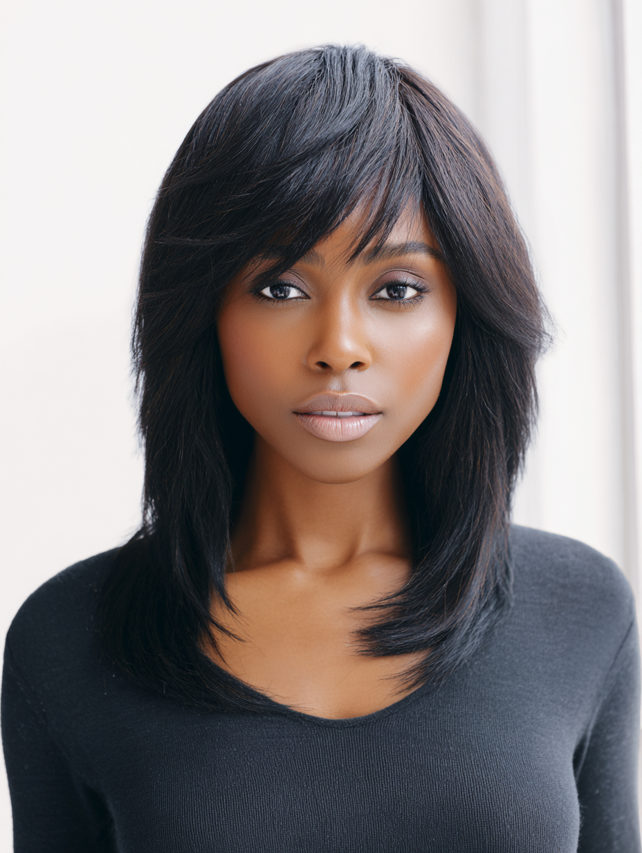Side swept bangs soften the overall shape and blend easily into medium layers.