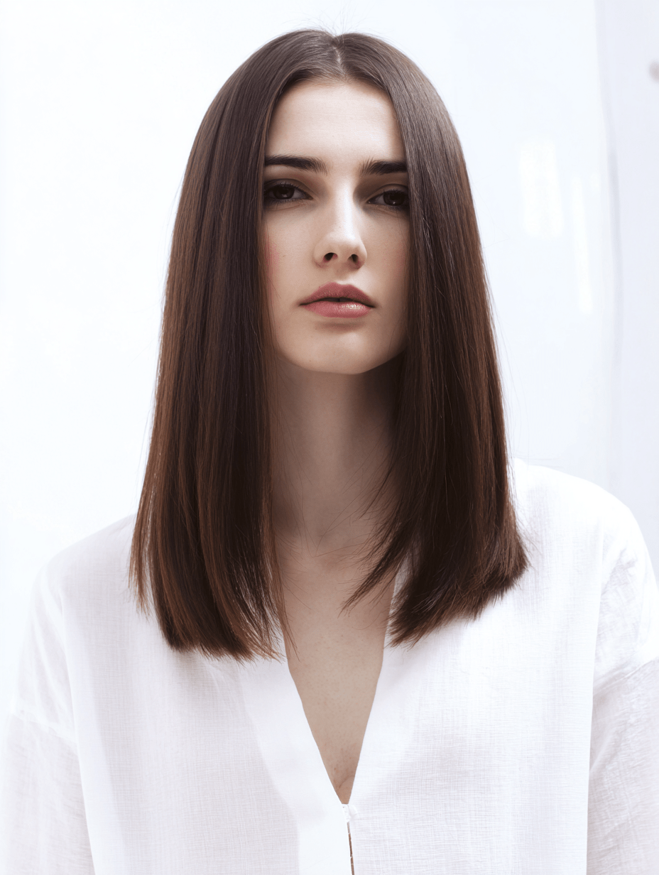 The straight shape emphasizes facial balance, while softened ends prevent the look from feeling too harsh.
