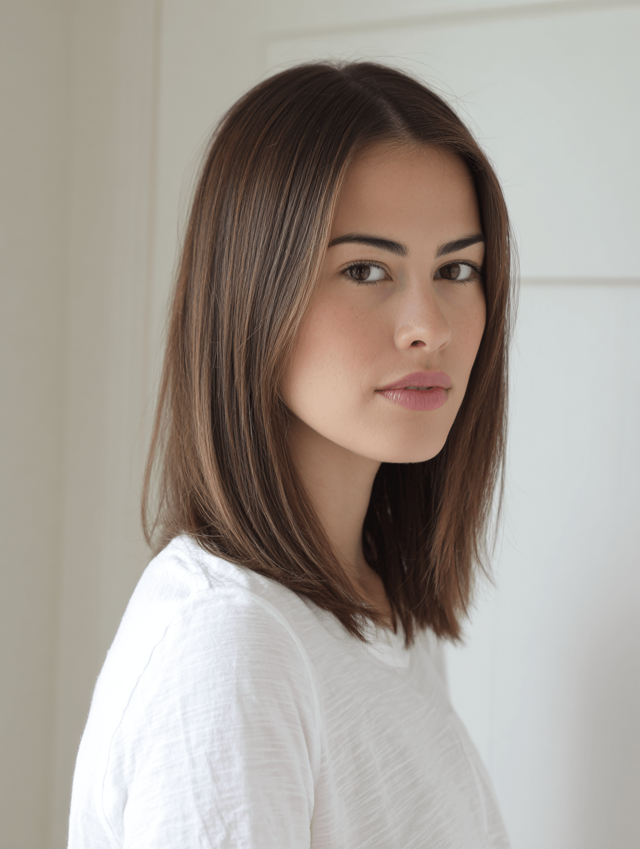 A medium straight cut with subtle layers highlights the natural balance of an oval face.