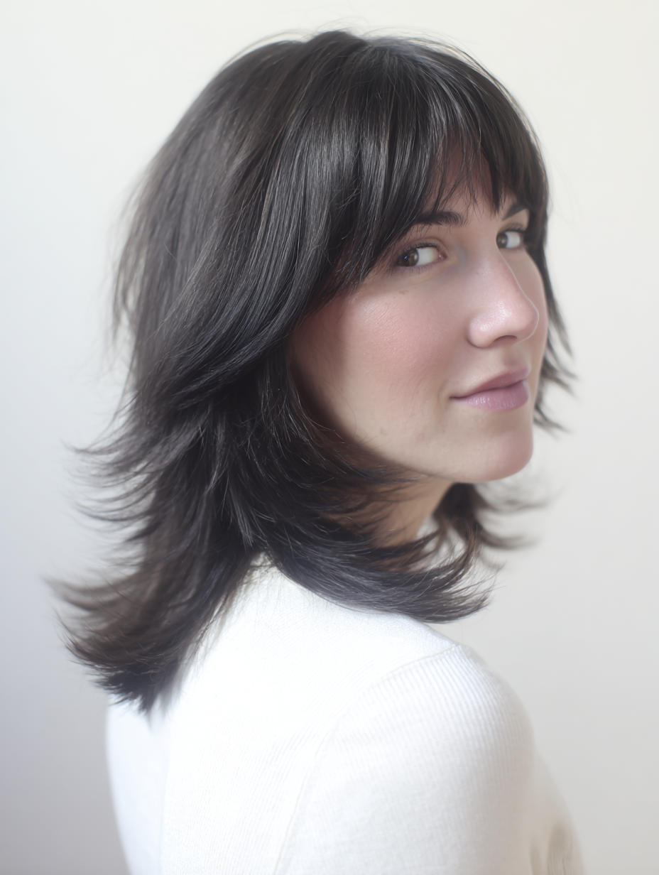 Soft curtain bangs frame the face while feathered layers create gentle lift near the crown.